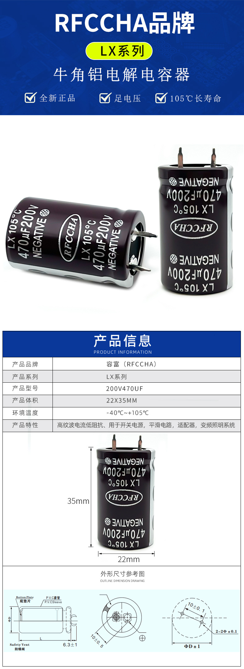 公称容量 200v470uf ボリューム 22x35m