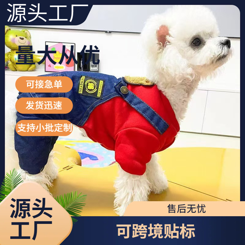 ペット犬小型犬テディ可愛い春秋服サスペンダー付きベアデニム四足スウェット小動物犬服