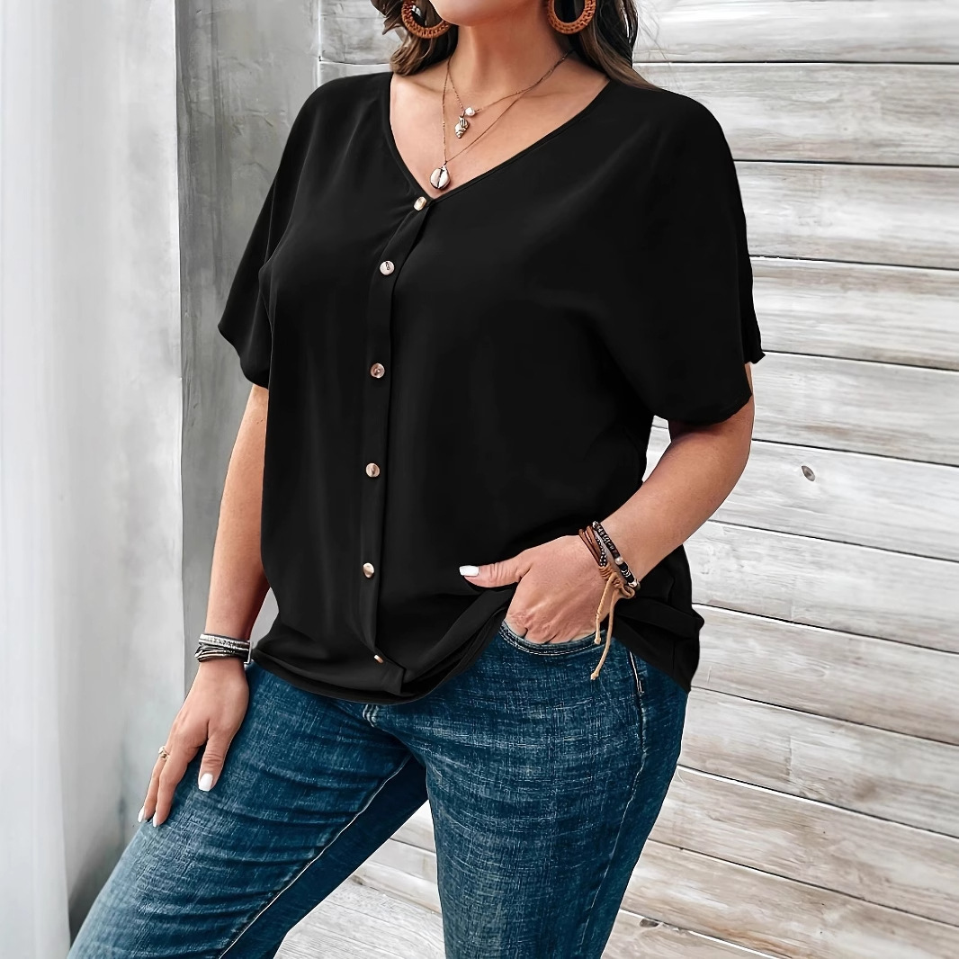 25 欧米風クロスボーダーレディースウェア Amazon Vネックプルオーバー半袖シングルボタンルーズTシャツシャツエレガントな雰囲気