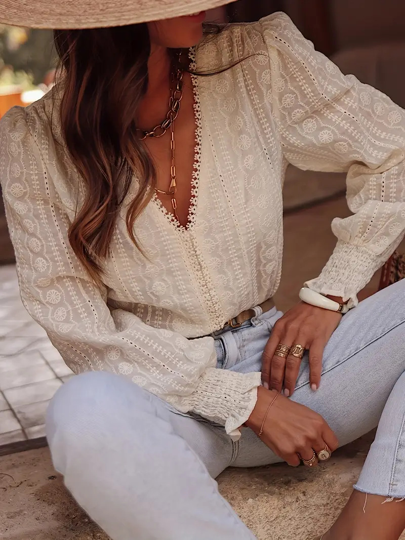 2025欧美跨境外贸女装优雅气质通勤时尚V领蕾丝拼接长袖衬衫衬衣