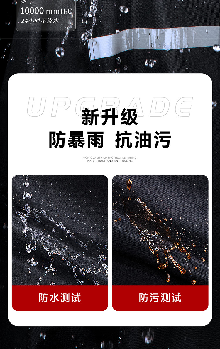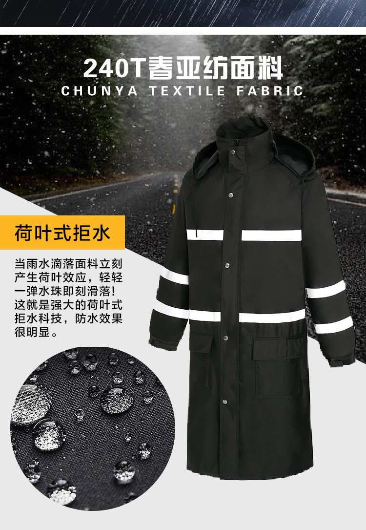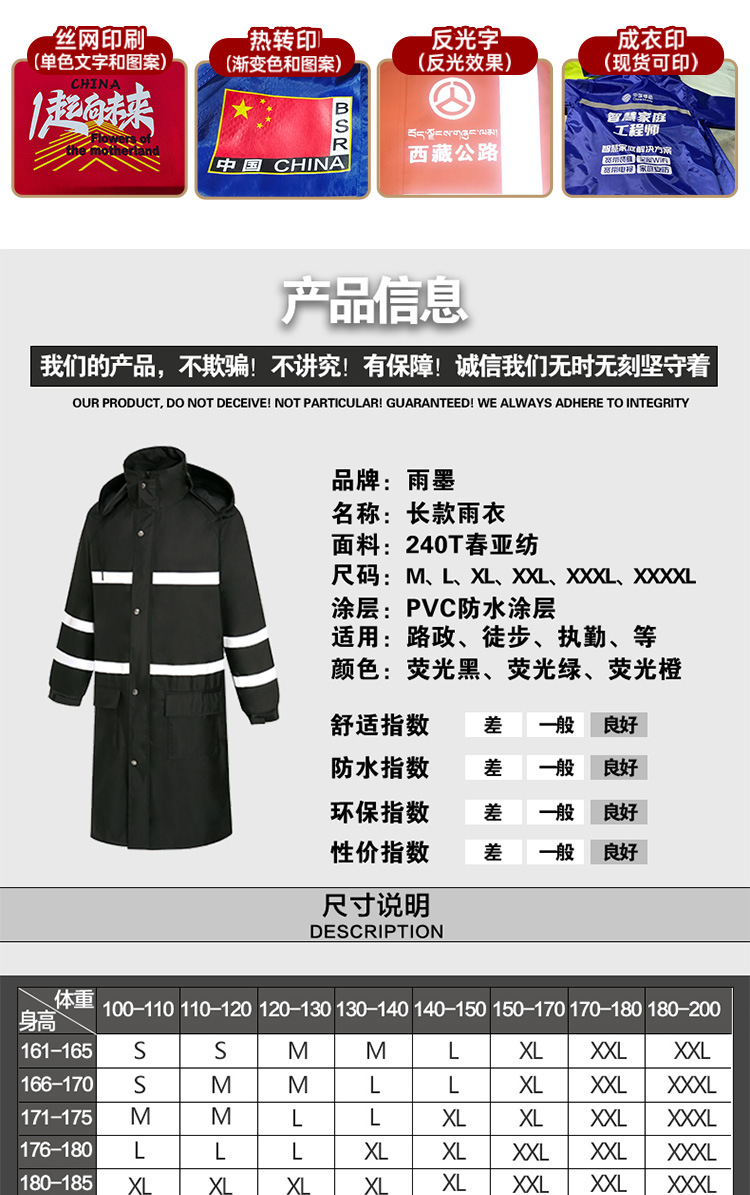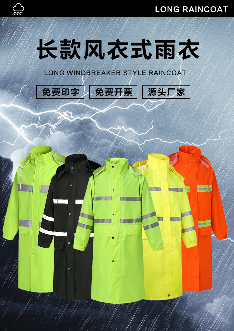 颜色 黑色:单光款(春亚纺面料+绸布内衬),黑色:多光款(240T斜纹春亚纺+网格内衬),荧光绿:双光款(牛津布面料+网格内衬),荧光绿:多光款(牛津布面料+网格内衬),橘色:单光款(牛津布面料+绸布内衬),橘色:双光款(牛津布面料+绸布内衬),迷彩:长款(150D牛津布),荧光黄:多光款(300D牛津布+PU涂层),黑色:PU雨裤(300D牛津布+网格内衬),荧光绿:PU雨裤(300D牛津布+网格内衬),荧光黄:PU雨裤(300D牛津布+网格内衬),橘色:PU雨裤(300D牛津布+网格内衬),黑风衣(网格内里)+大帽檐 L