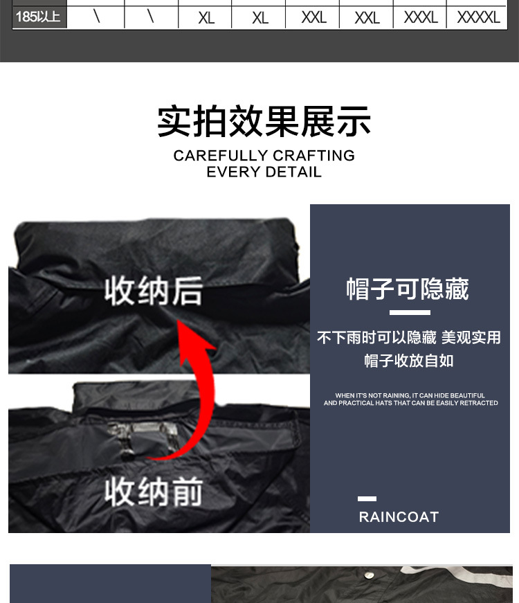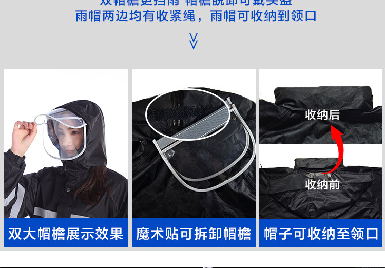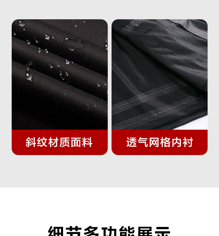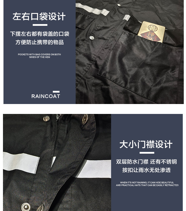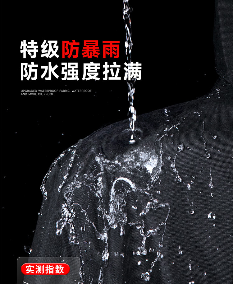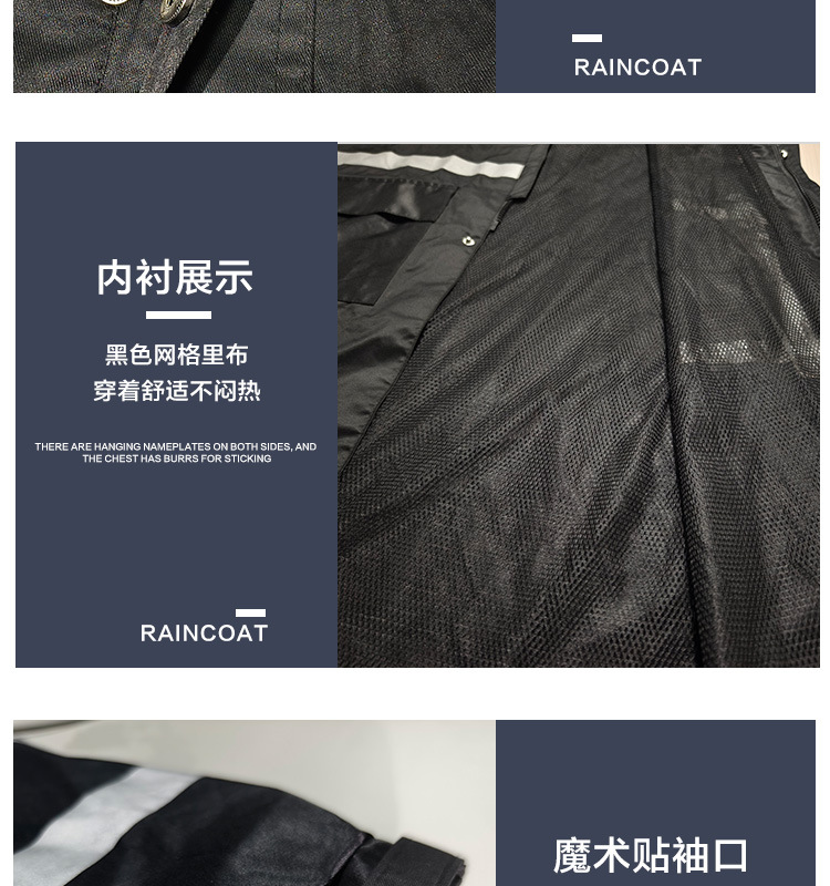 颜色 黑色:单光款(春亚纺面料+绸布内衬),黑色:多光款(240T斜纹春亚纺+网格内衬),荧光绿:双光款(牛津布面料+网格内衬),荧光绿:多光款(牛津布面料+网格内衬),橘色:单光款(牛津布面料+绸布内衬),橘色:双光款(牛津布面料+绸布内衬),迷彩:长款(150D牛津布),荧光黄:多光款(300D牛津布+PU涂层),黑色:PU雨裤(300D牛津布+网格内衬),荧光绿:PU雨裤(300D牛津布+网格内衬),荧光黄:PU雨裤(300D牛津布+网格内衬),橘色:PU雨裤(300D牛津布+网格内衬),黑风衣(网格内里)+大帽檐 L