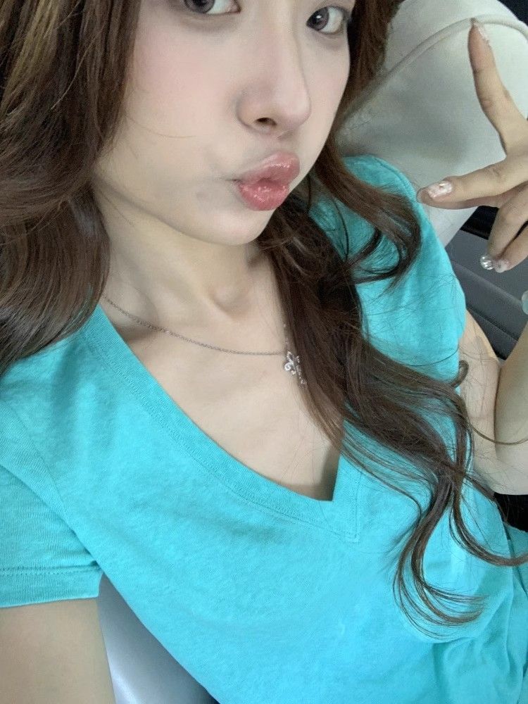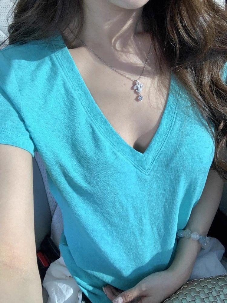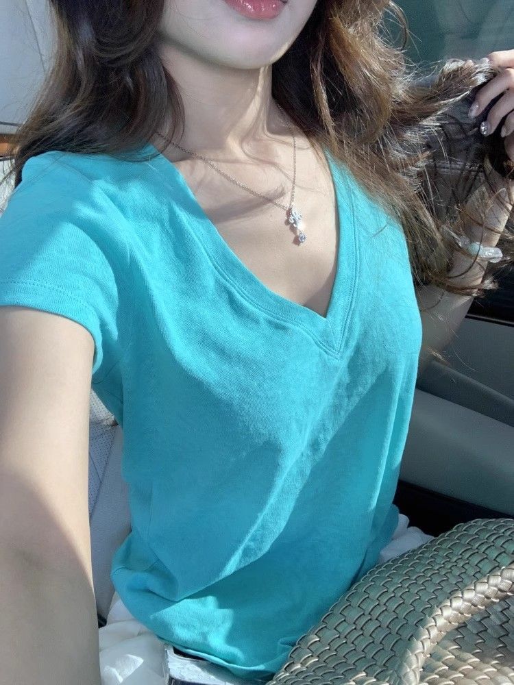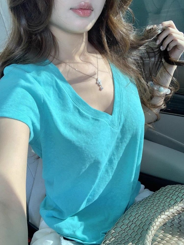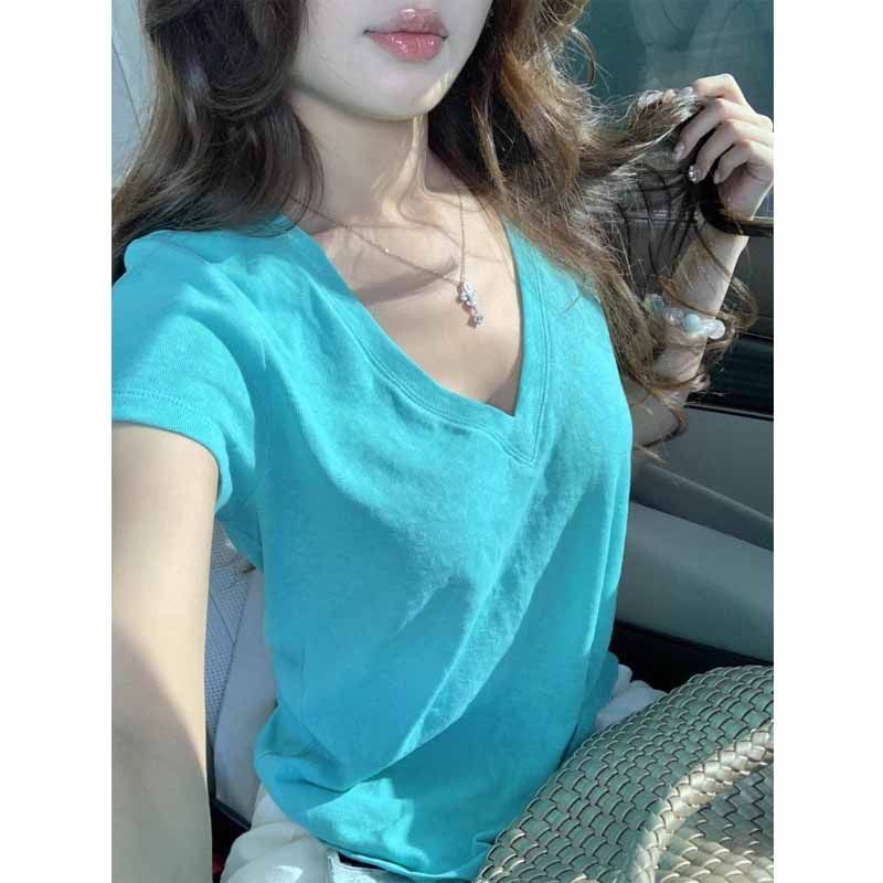 纯欲风冰川蓝正肩V领短袖T恤女夏季2025新款小众休闲低领宽松上衣