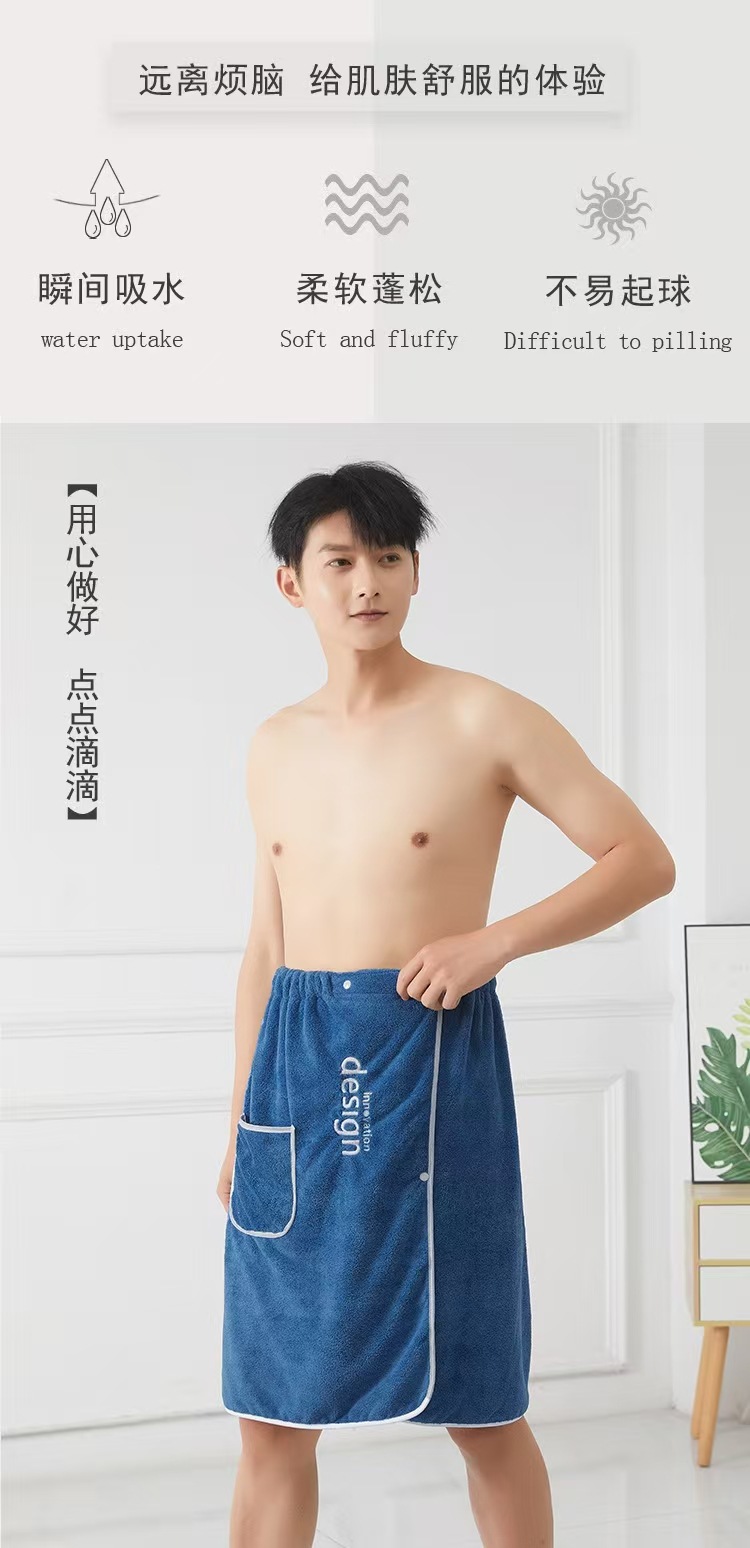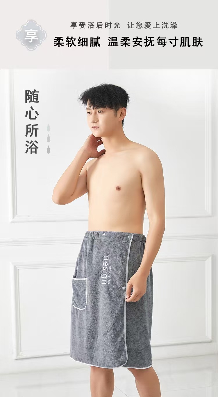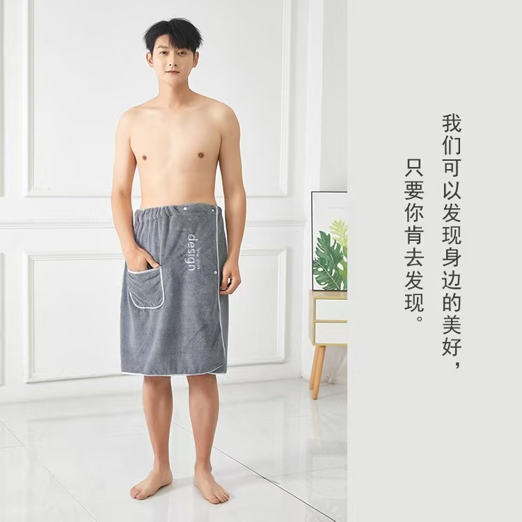 バススカートメンズコーラルベルベット卸売吸水性が高く、着用可能で巻き付け可能、ホームバスローブ、調節可能な伸縮性のある刺繍入りバスタオル