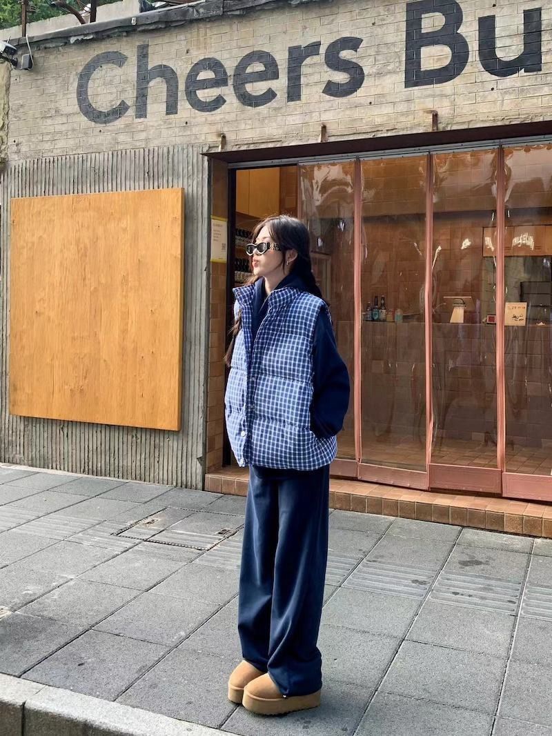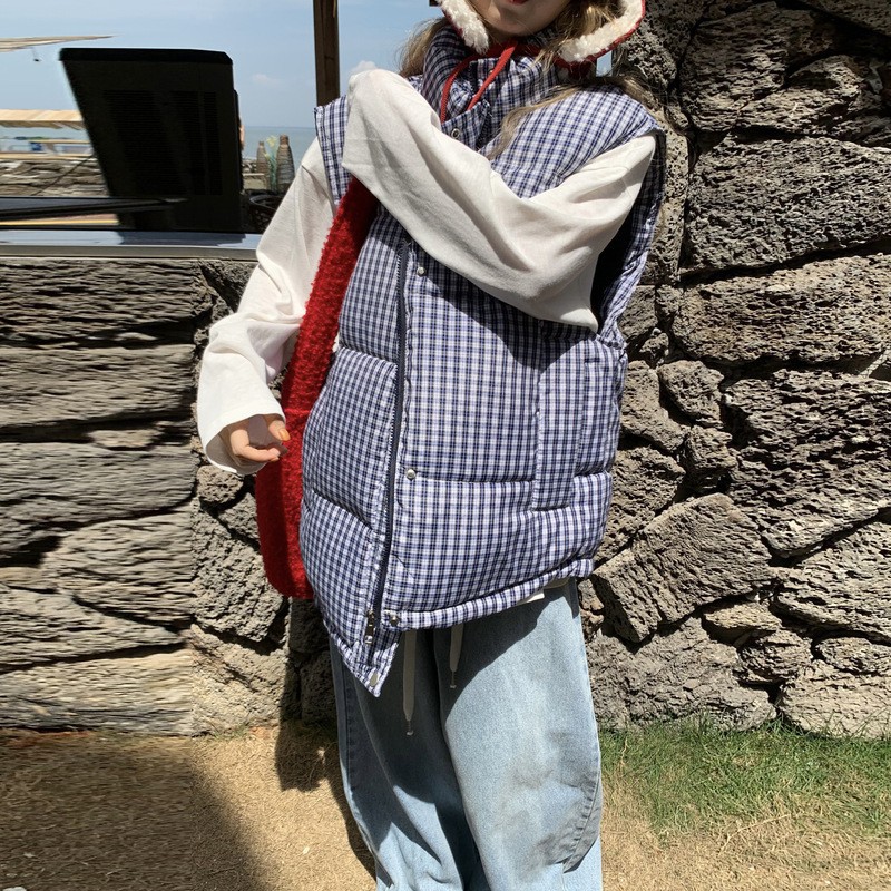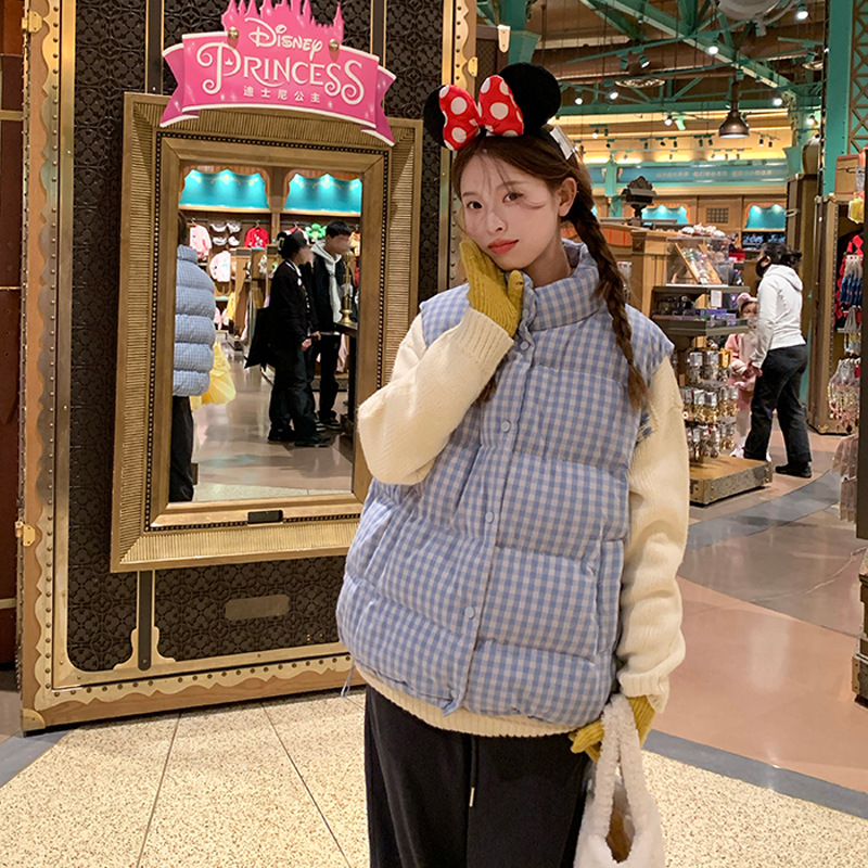 韩系复古蓝色格子立领无袖百搭棉服马甲背心女秋冬季加厚棉衣外套