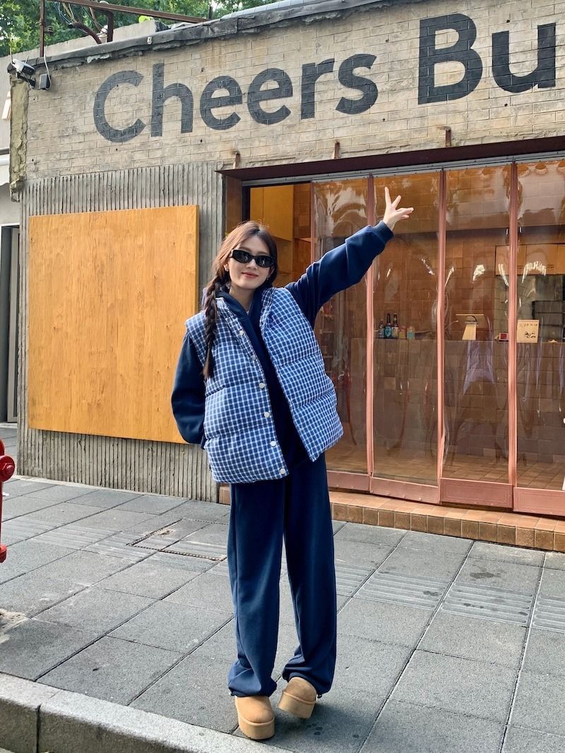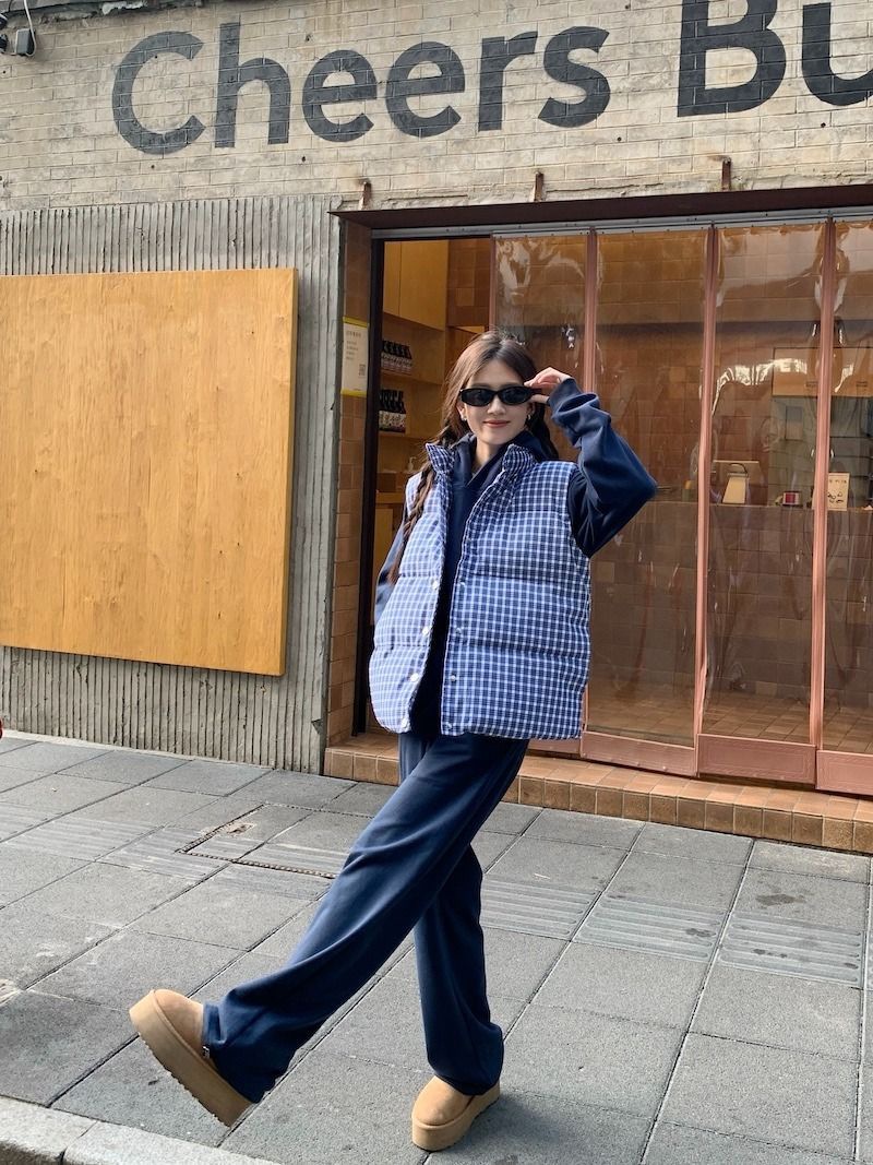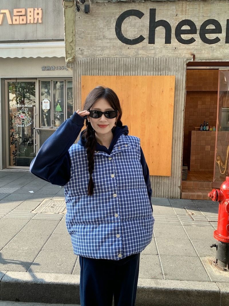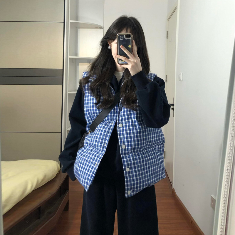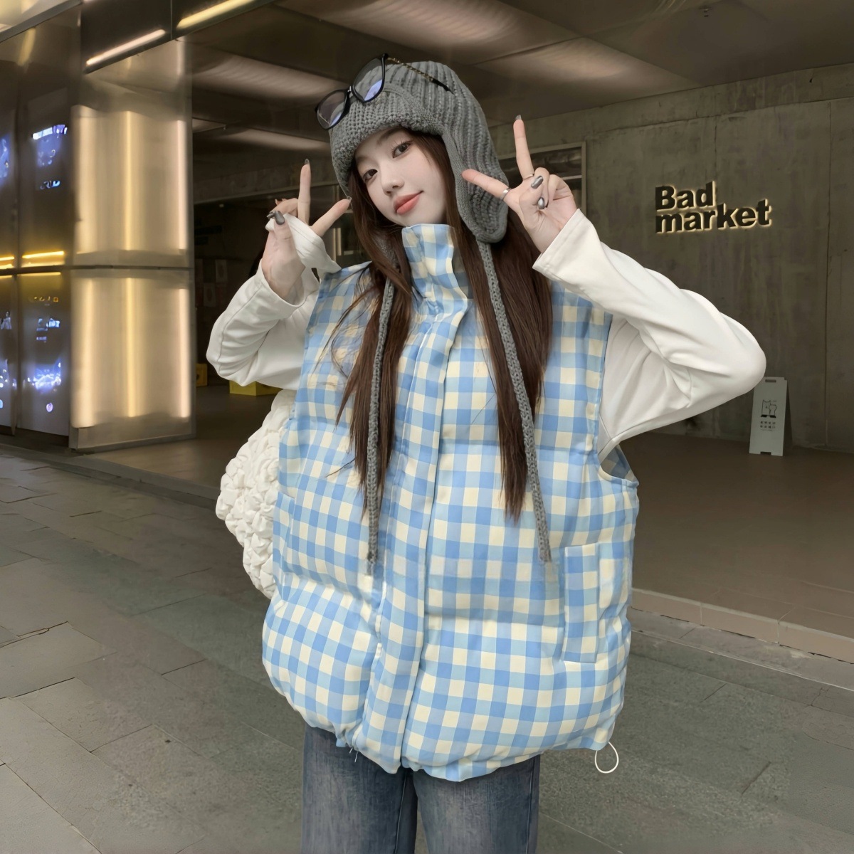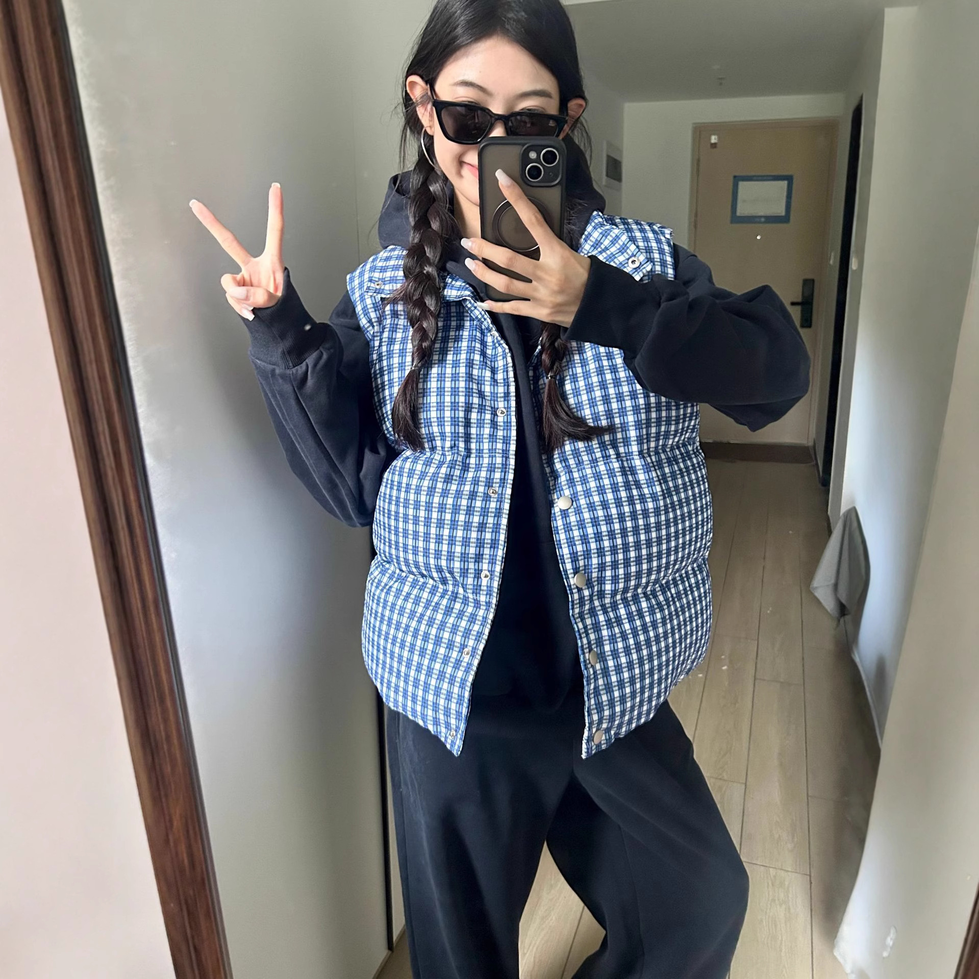 2025蓝色格子棉服新款马甲女秋冬季宽松休闲保暖坎肩无袖加厚外套