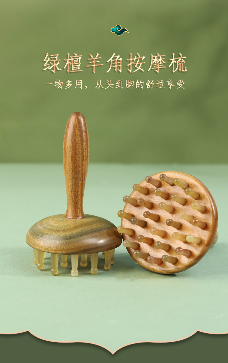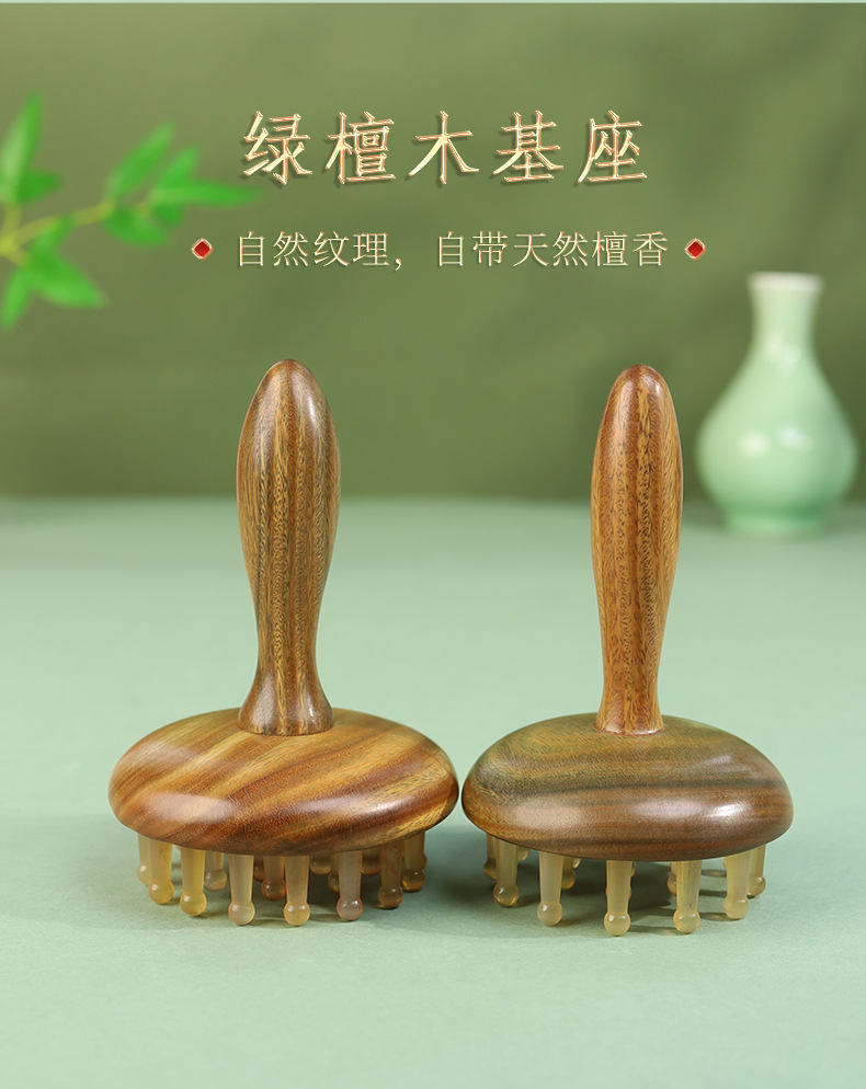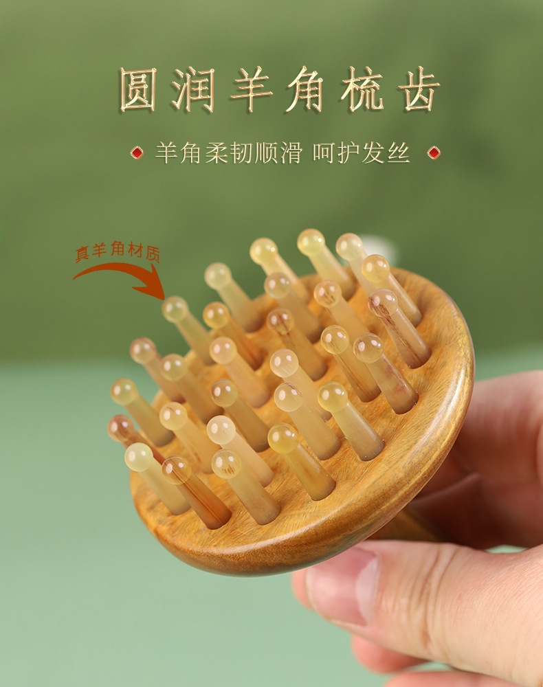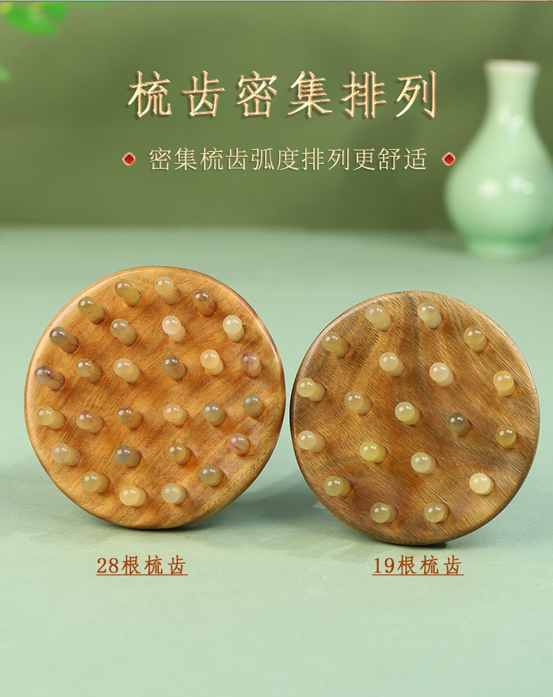 羊角按摩梳绿檀木头部经络28钉圆盘插齿梳指环梳按摩头皮养发