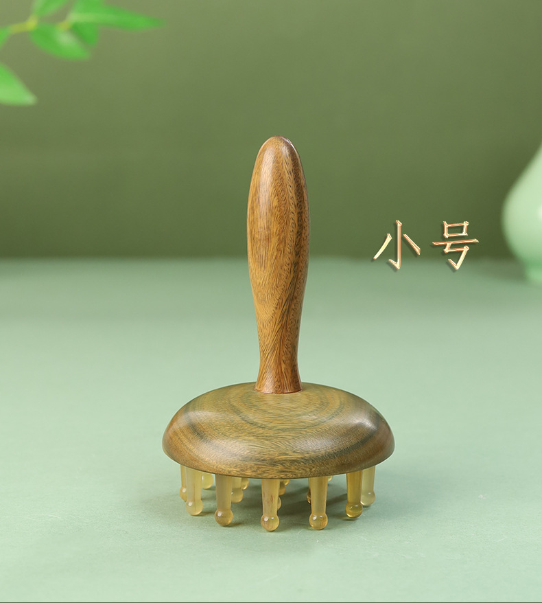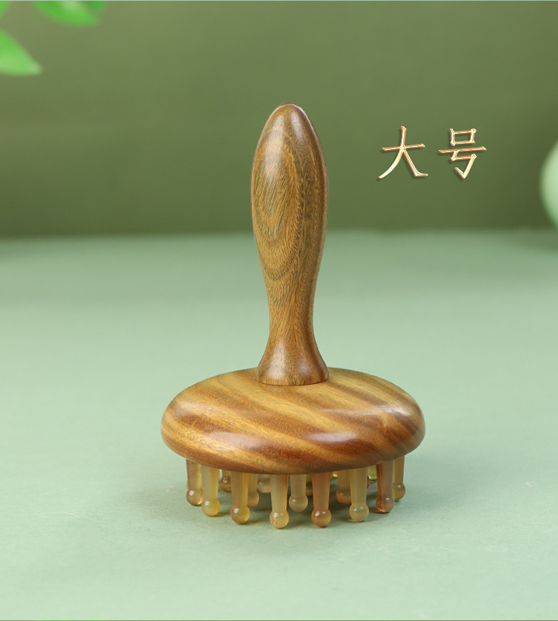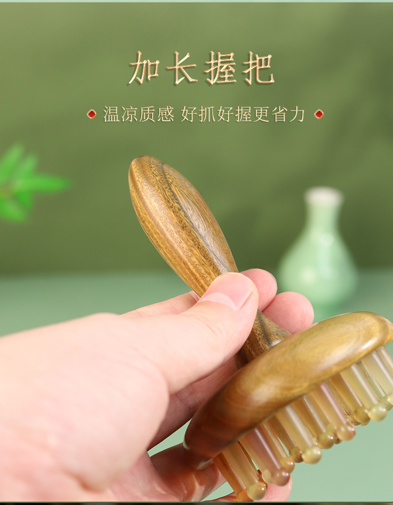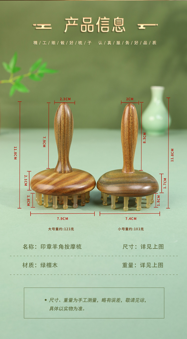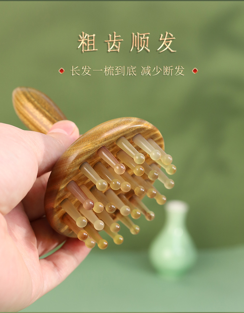 羊角按摩梳绿檀木头部经络28钉圆盘插齿梳指环梳按摩头皮养发