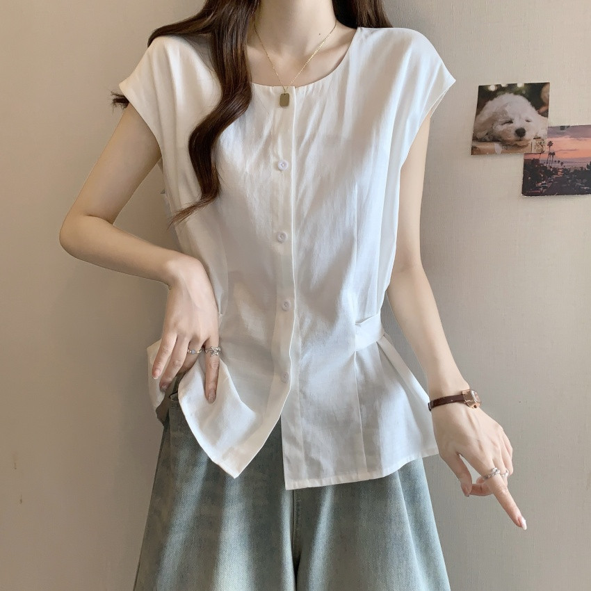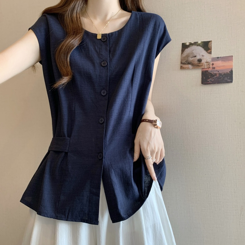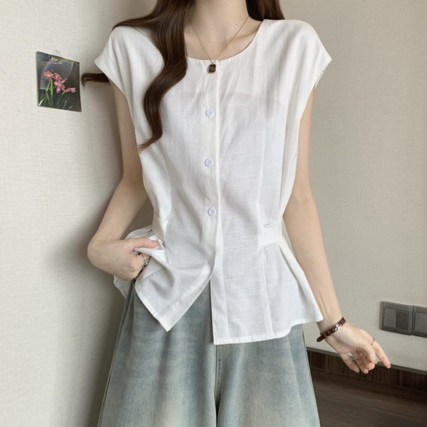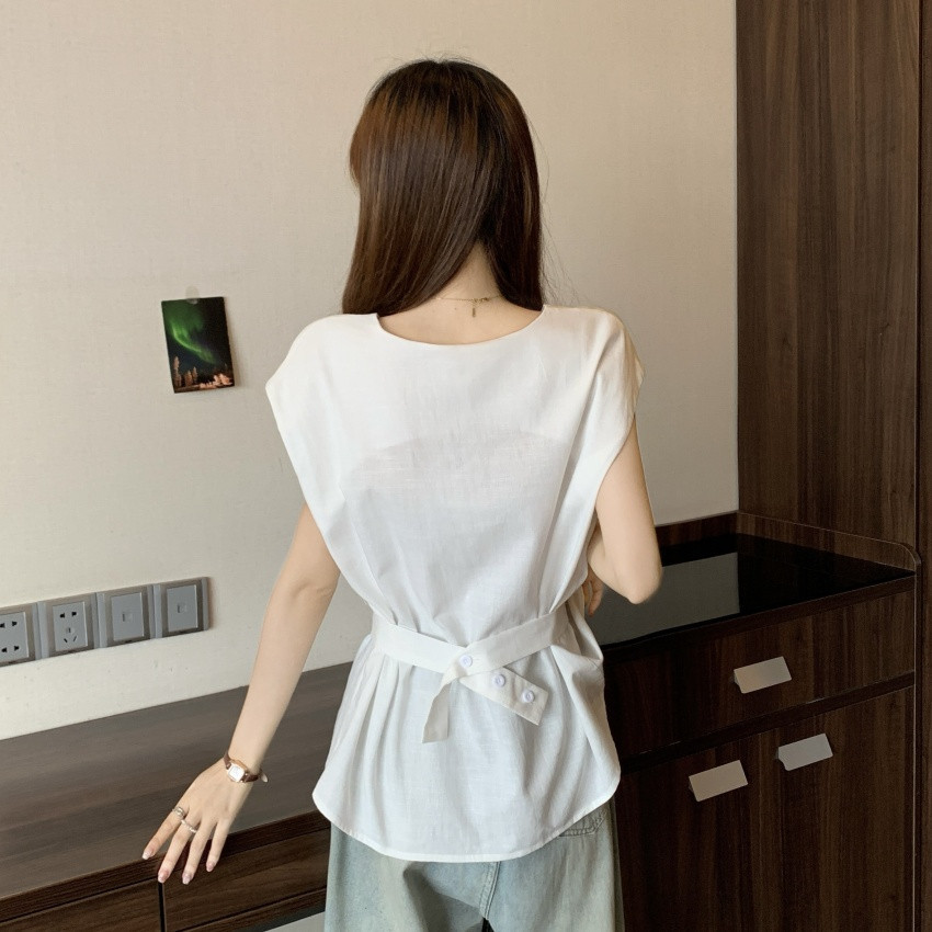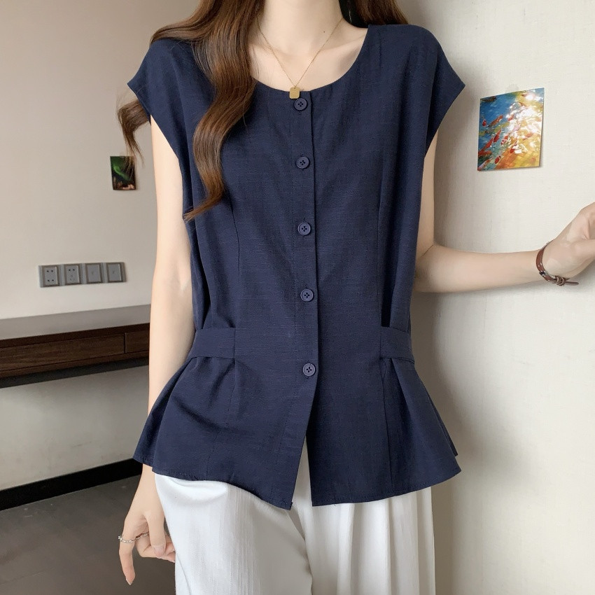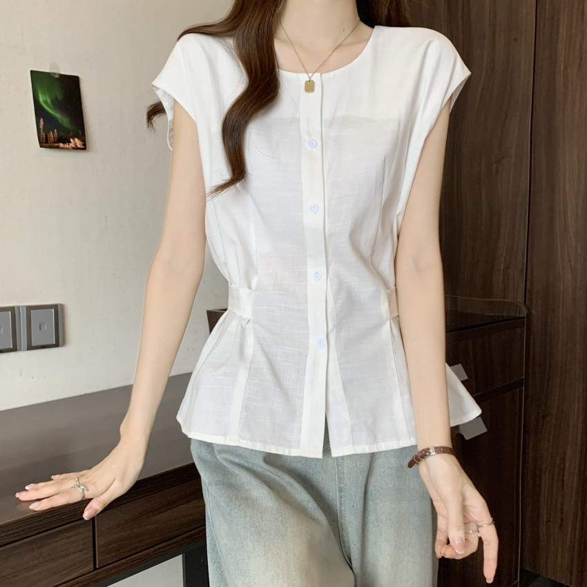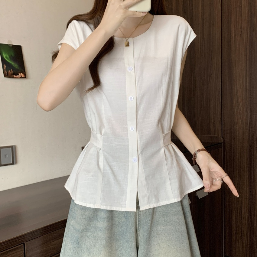 K4H 半袖シャツ女性のための夏の 2025 新しいハイエンドライト高級ハイエンドウエスト痩身コットンとリネントップ