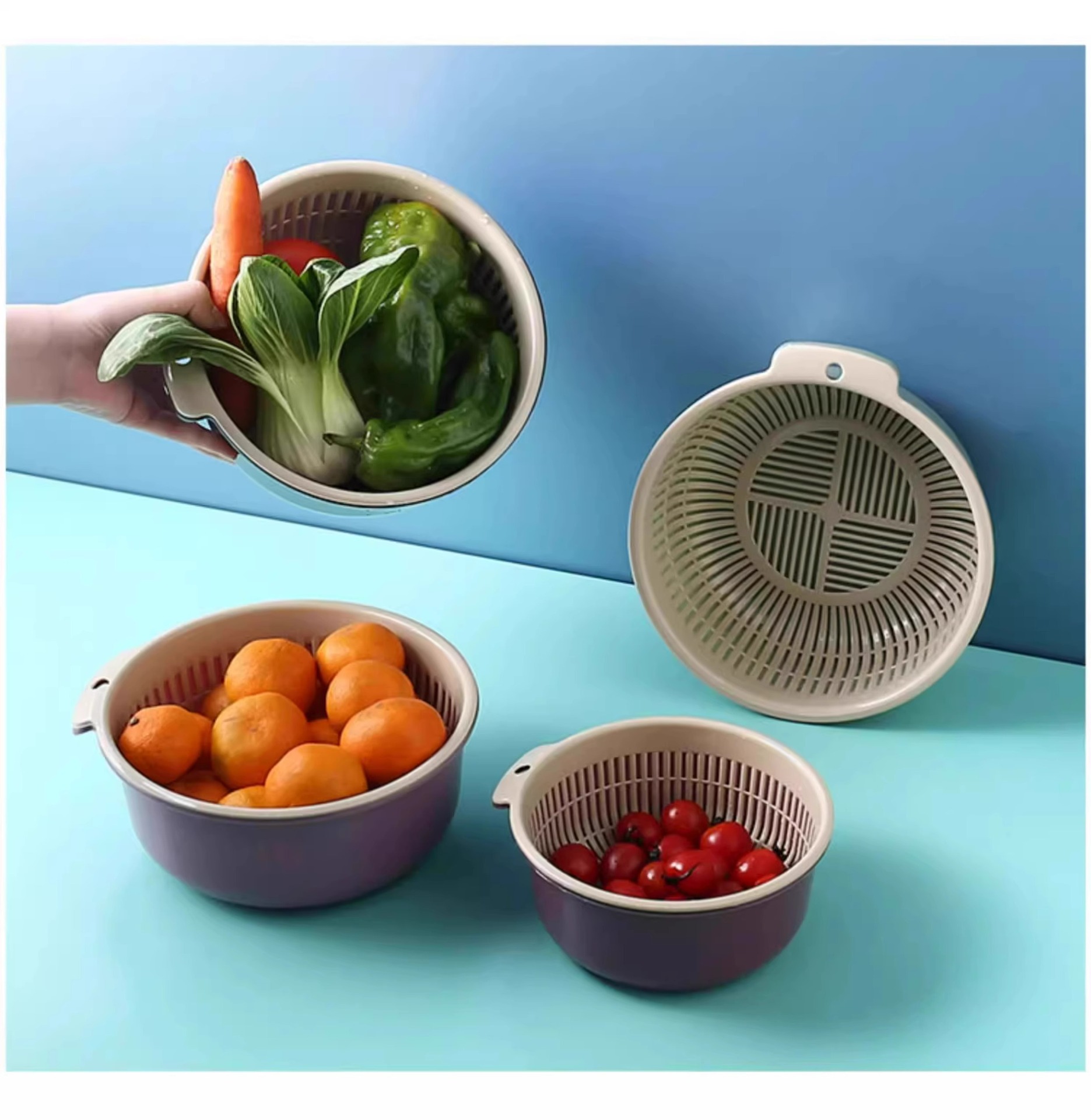 厚みのある丸型二層水切りかご6点セット、野菜洗いかご、キッチン野菜洗い・米洗いかご、卸売野菜洗い桶