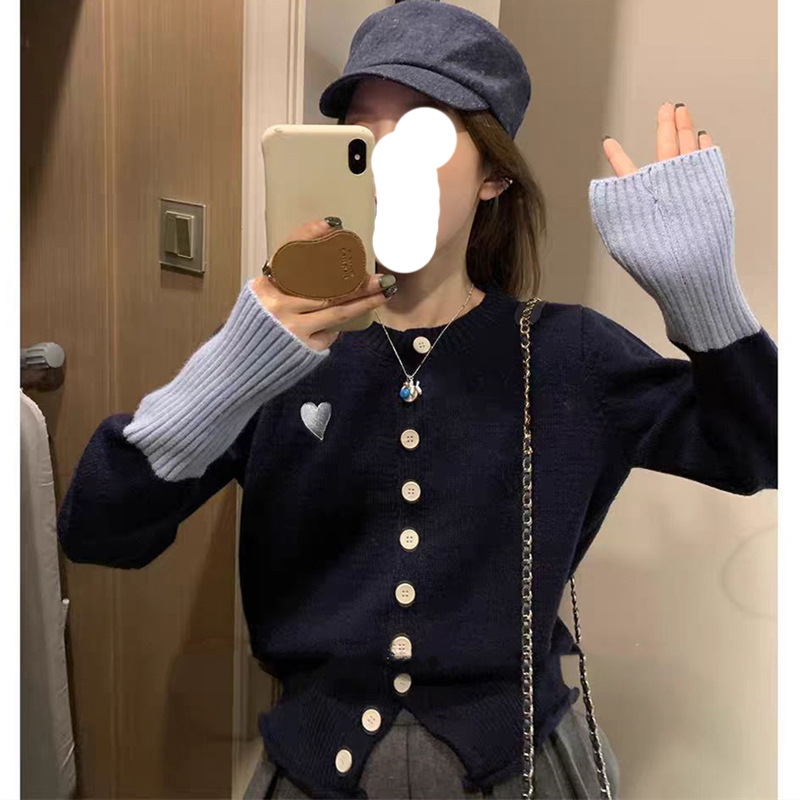 コントラストカラーステッチラブ刺繍ラウンドネックセーターカーディガン女性のための 2025 初秋ハイエンド気質スリムニットトップ