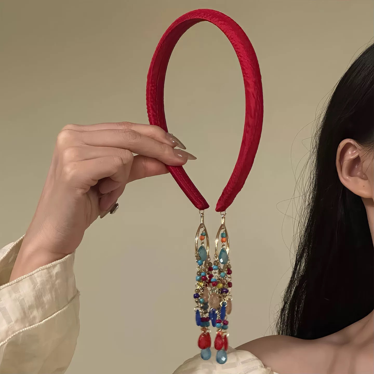 カラフルなボヘミアンエスニックスタイルの赤いタッセルヘアバンドライスビーズタッセルエキゾチックなハイエンドのヘアピンヘアアクセサリー