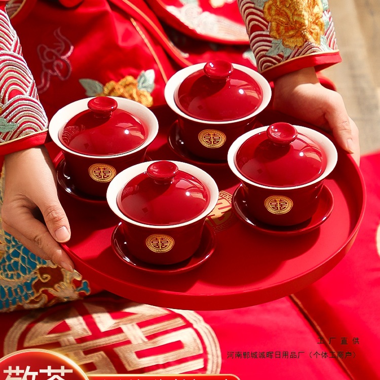 結婚式のお茶カップ、結婚式のボウル、女性の持参金用品、赤い変更された蓋付きボウル、ティーセット、ボウルと食器のセット