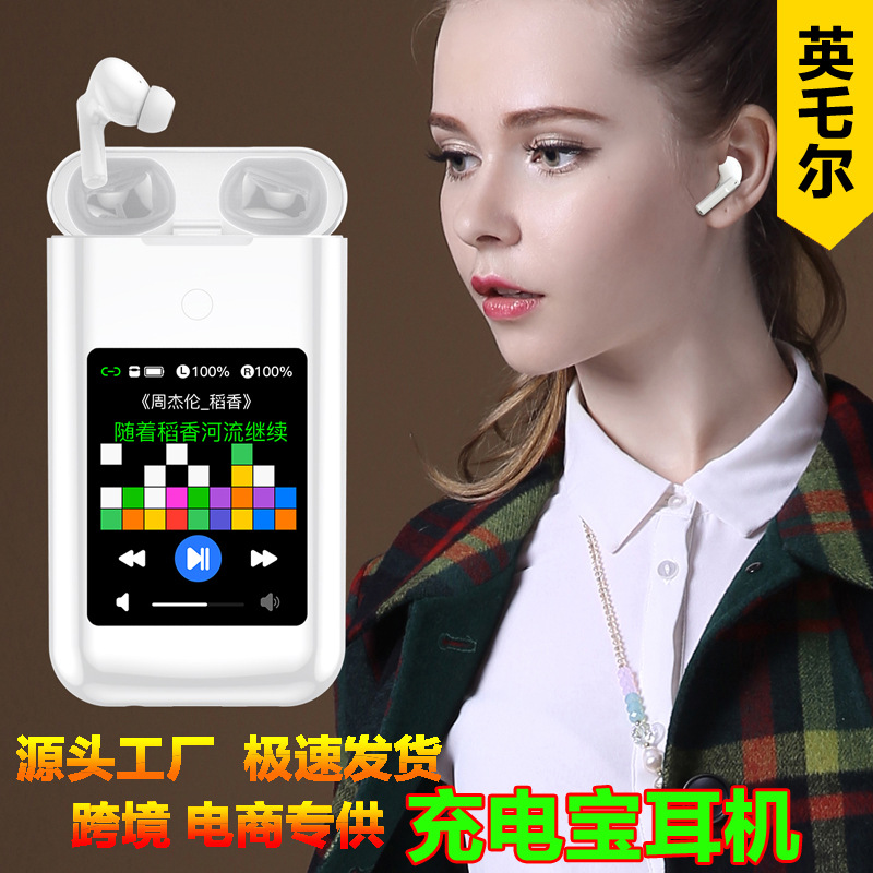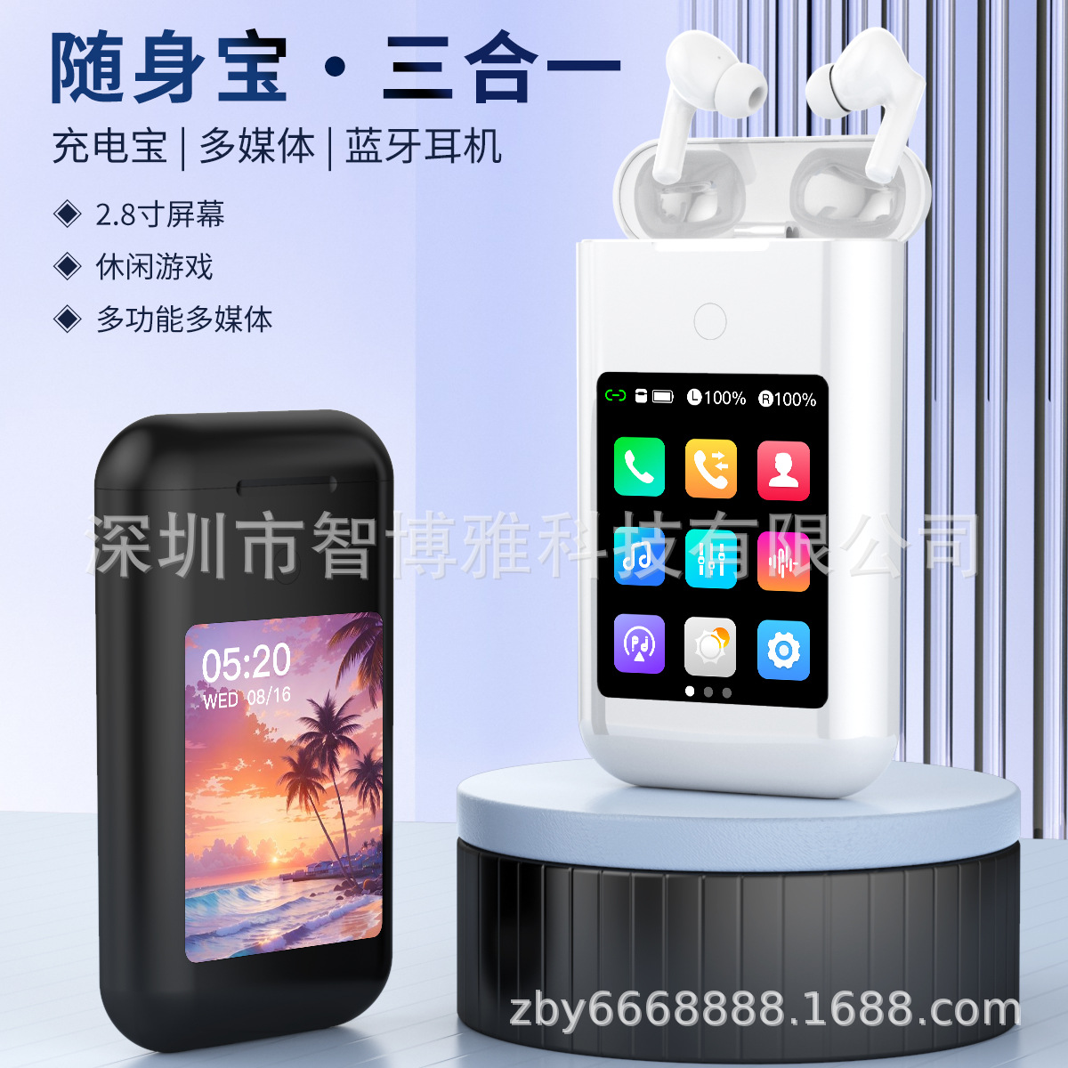 新品跨境无线蓝牙耳机快充充电宝2.8寸多媒体显示屏3合1移动电源