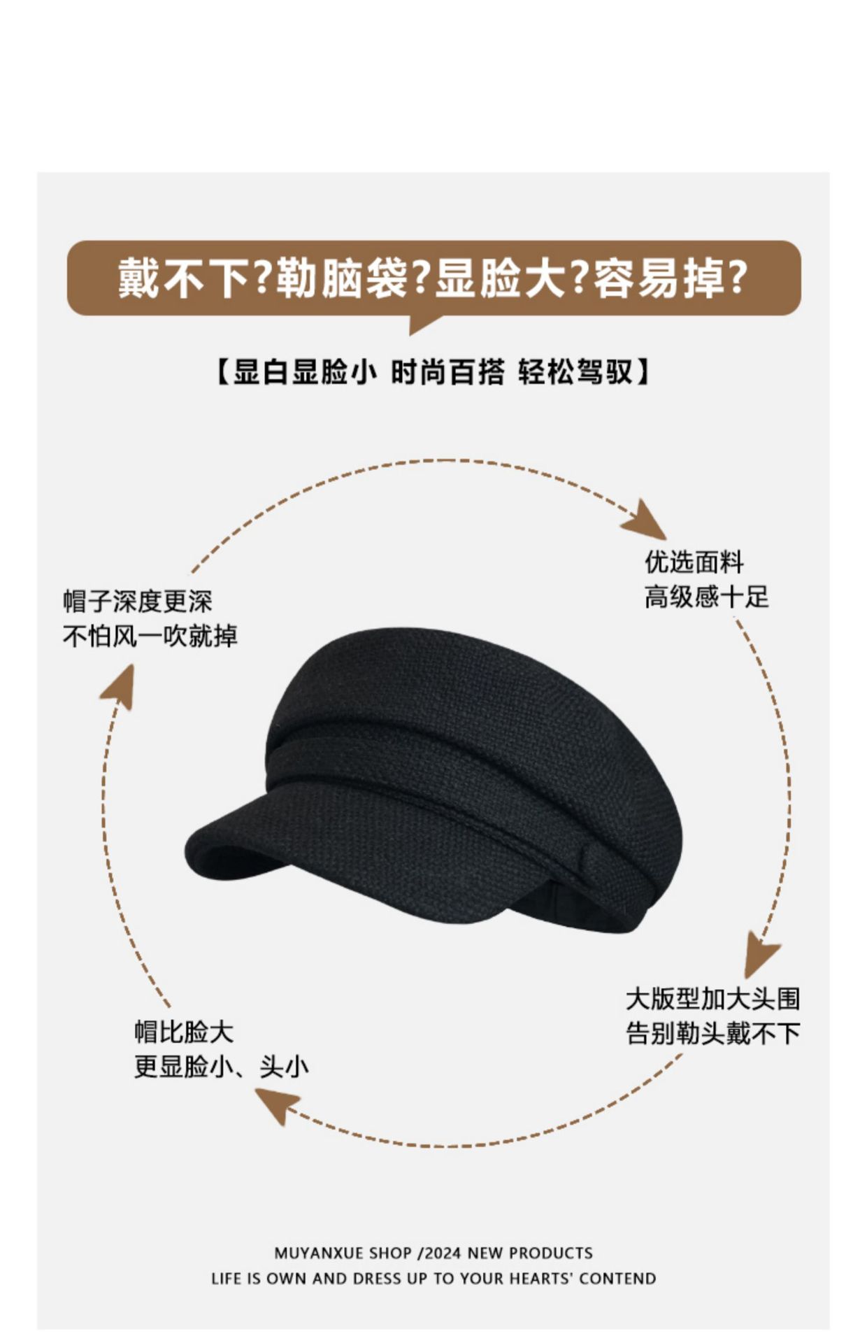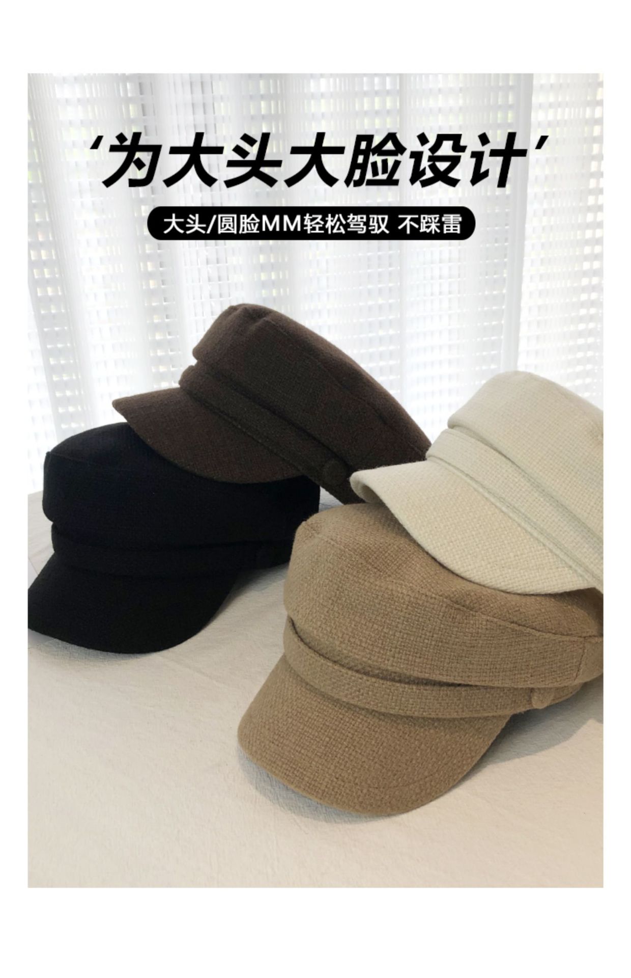 复古麂皮绒褶皱平顶鸭舌帽女大头围显脸小百搭新款报童帽出游通勤