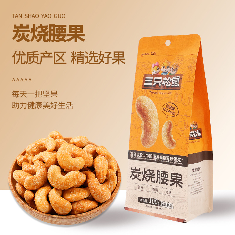 批发三只松鼠炭烧腰果100g新鲜即食每日坚果仁解馋休闲零食包邮