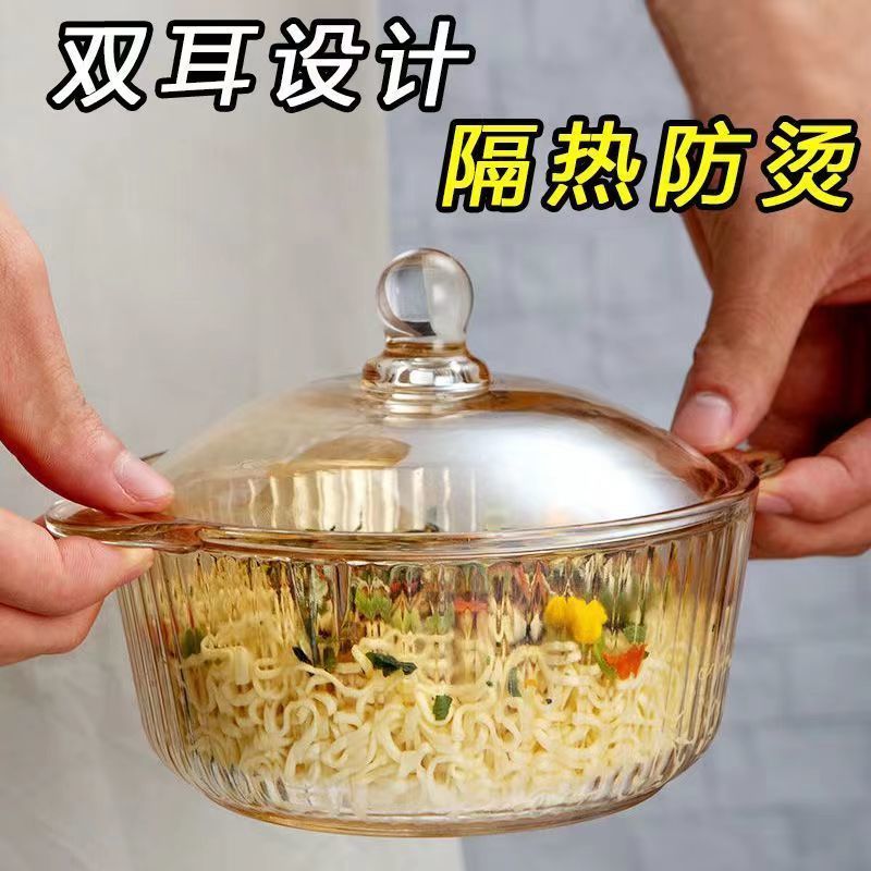 韓国式ins電子レンジ専用耐熱透明ガラスボウル茶色蓋付きスープボウル両耳泡麺ボウル家庭用工場