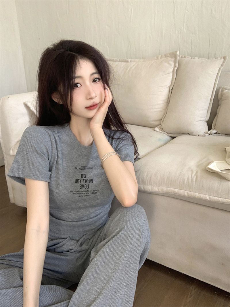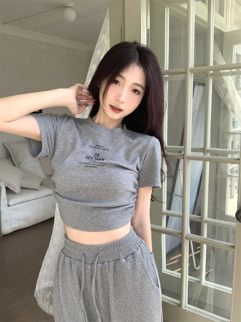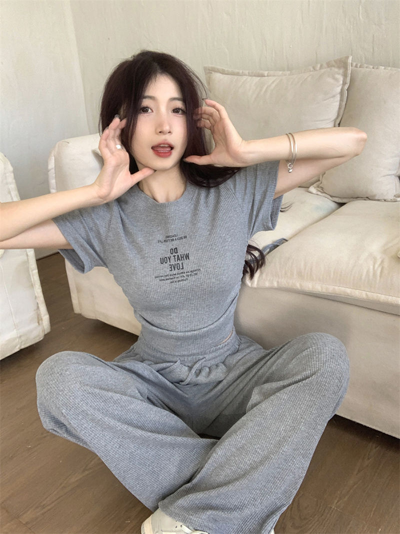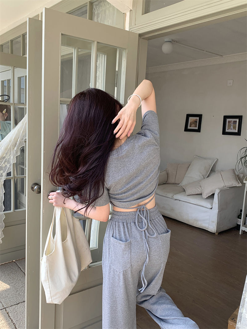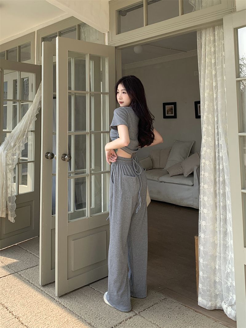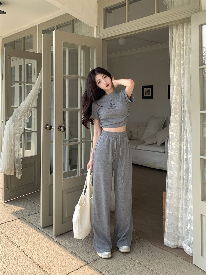 ピュアセクシーグレースーツ女性用、甘くておしゃれなホットガール、巾着半袖トップス、ストレートワイドレッグパンツ2点セット