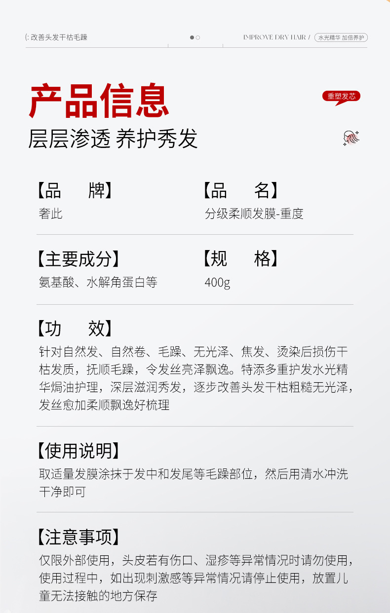 净含量 分级柔顺发膜-重度400g(红白款),分级柔顺发膜-中度400g,分级柔顺发膜-轻度400g