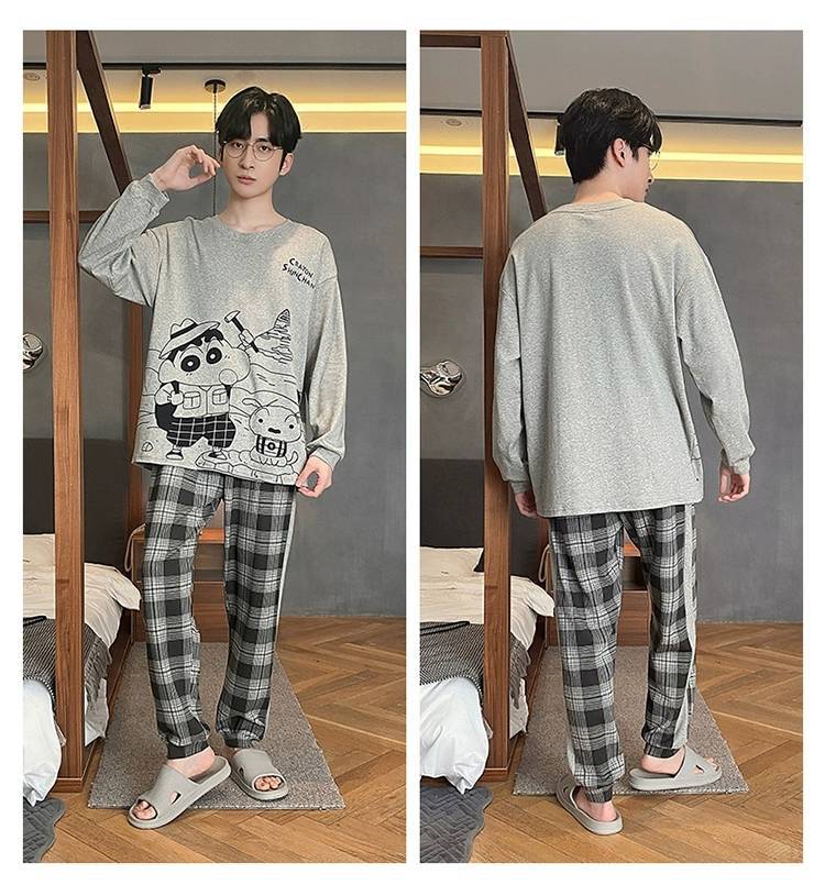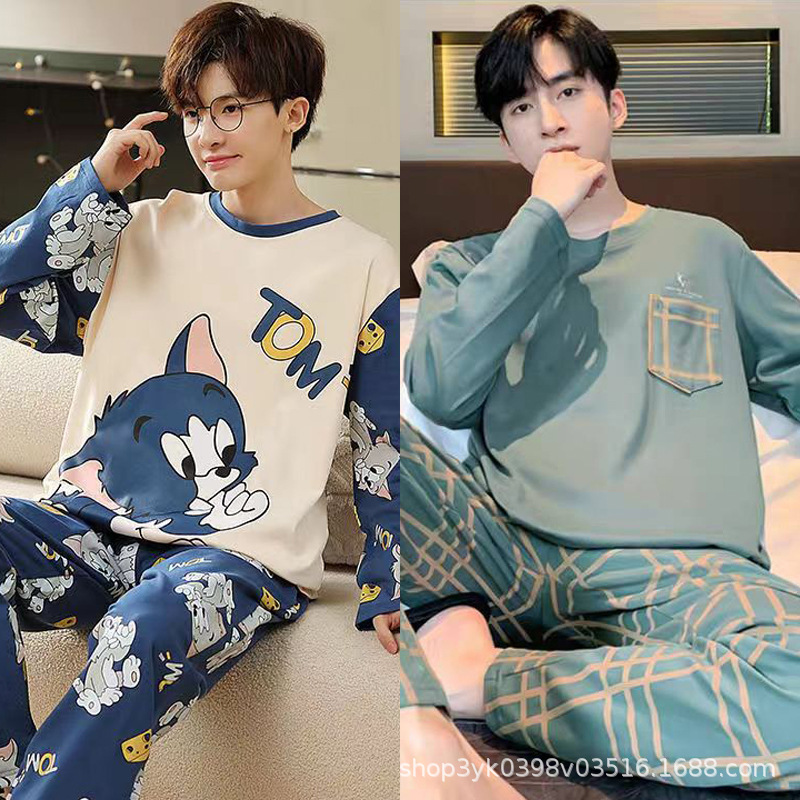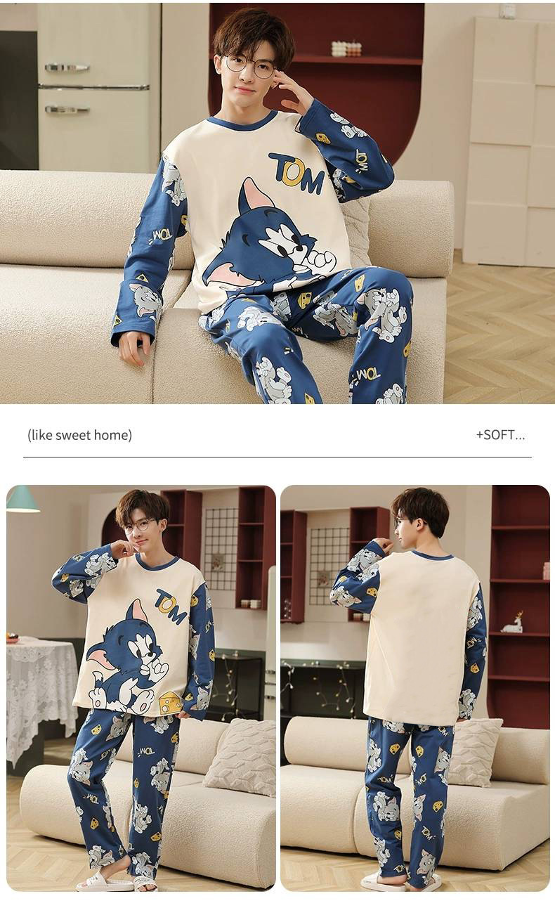 男性用パジャマ春と秋のラウンドネック長袖ズボンスーツ漫画トムキャットカジュアルウェアラブル薄型メンズホーム