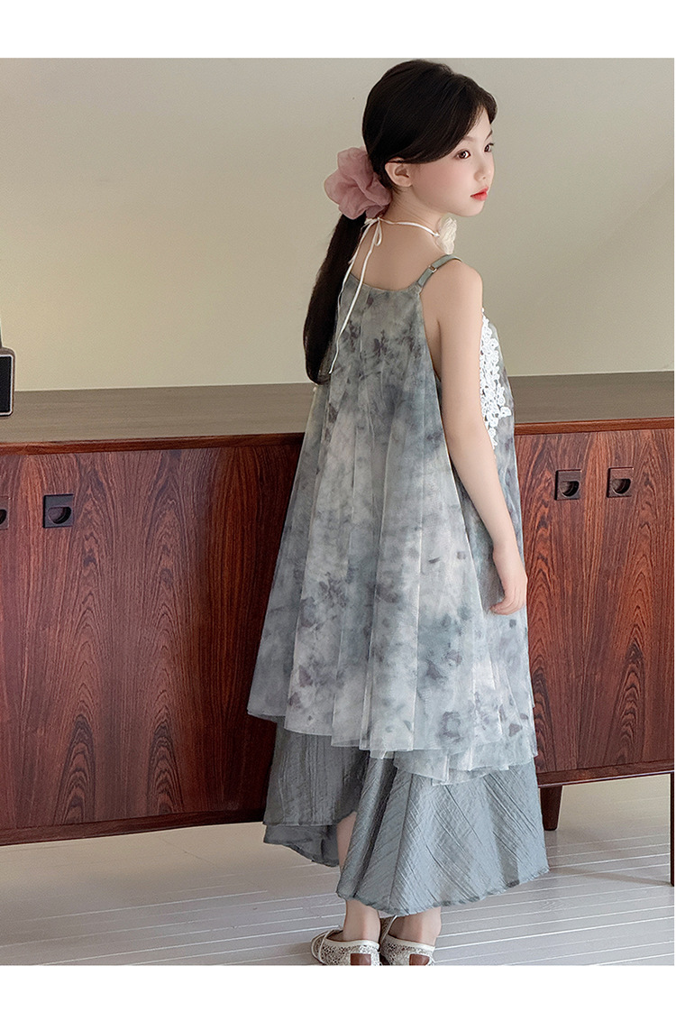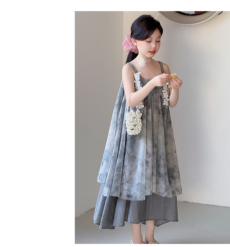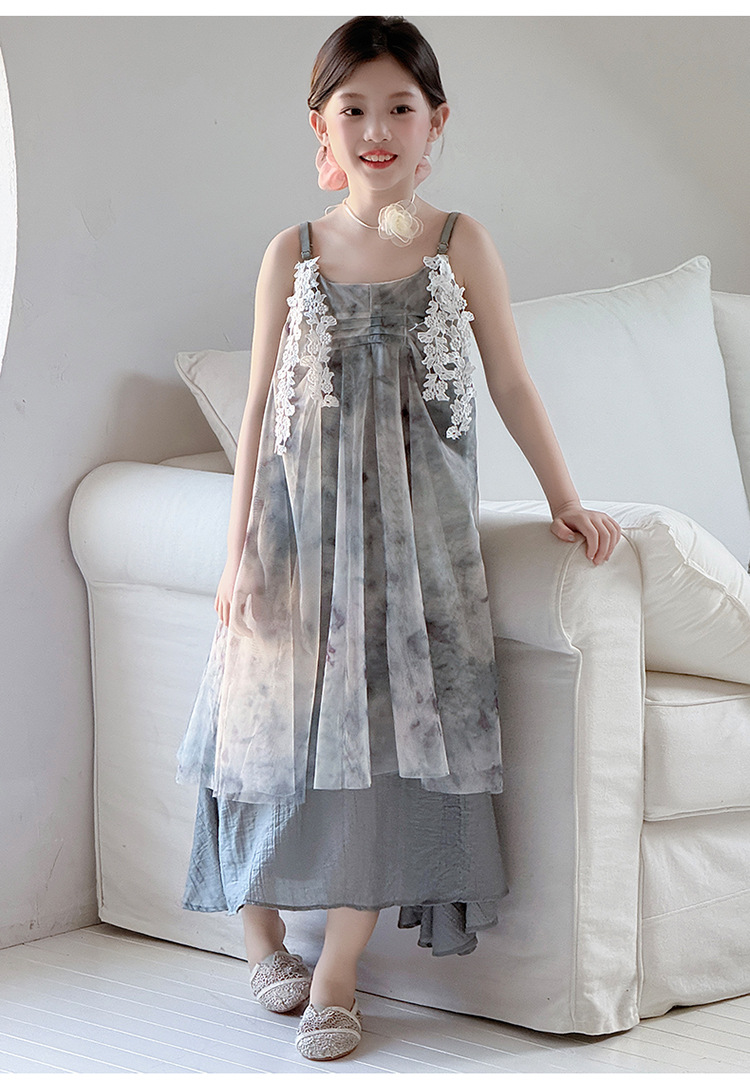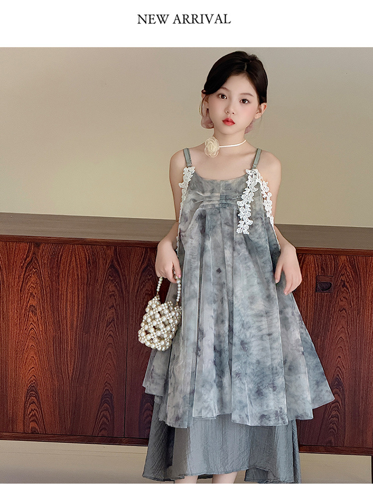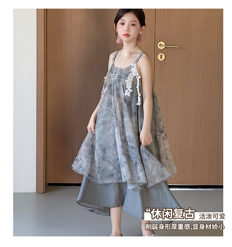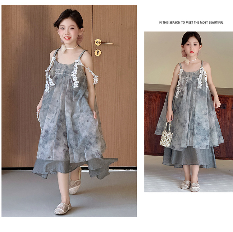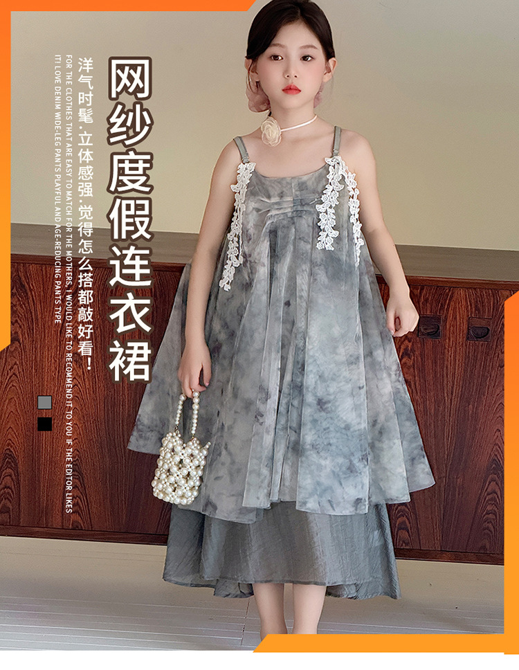 女の子のリゾートスタイルドレス2025夏の新しい大きな子供の水墨画サスペンダースカート西洋スタイルファッショナブルなメッシュスカート