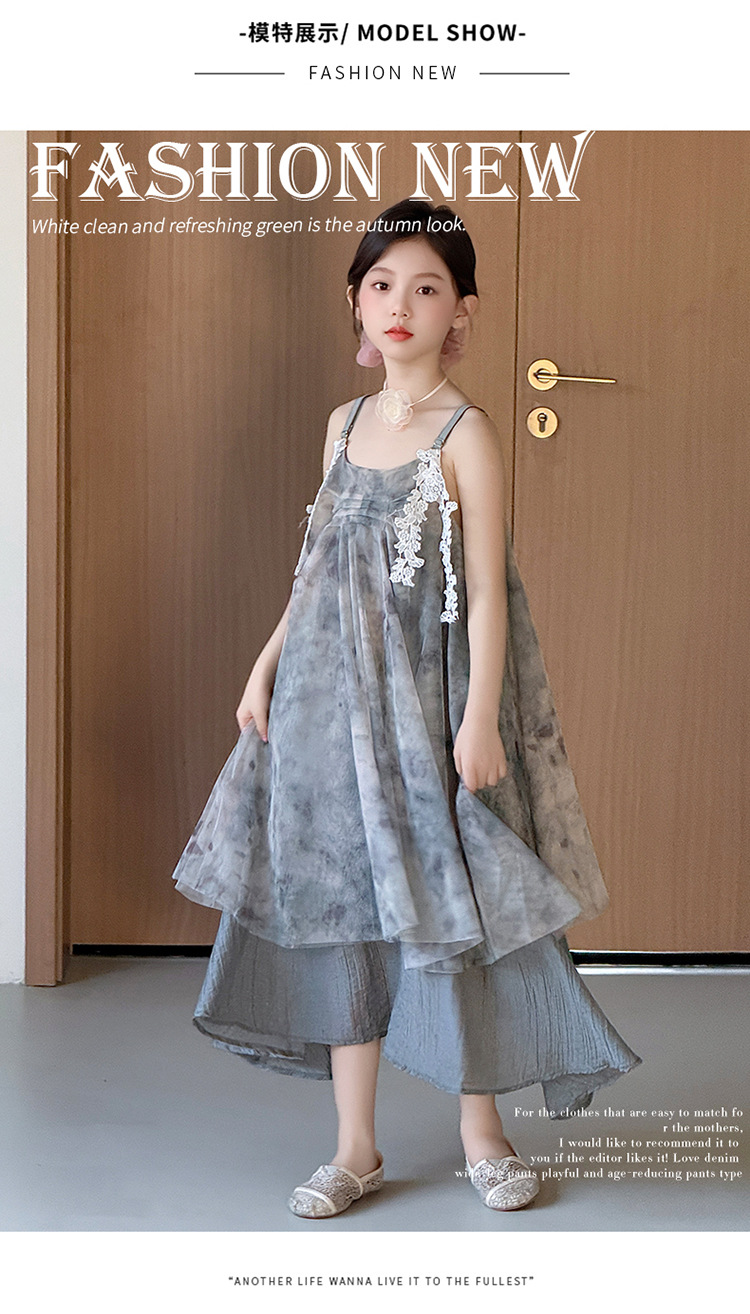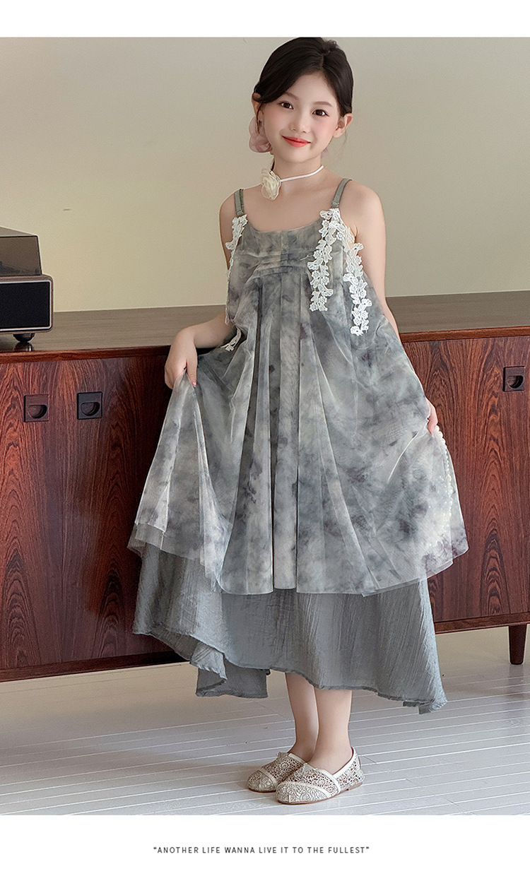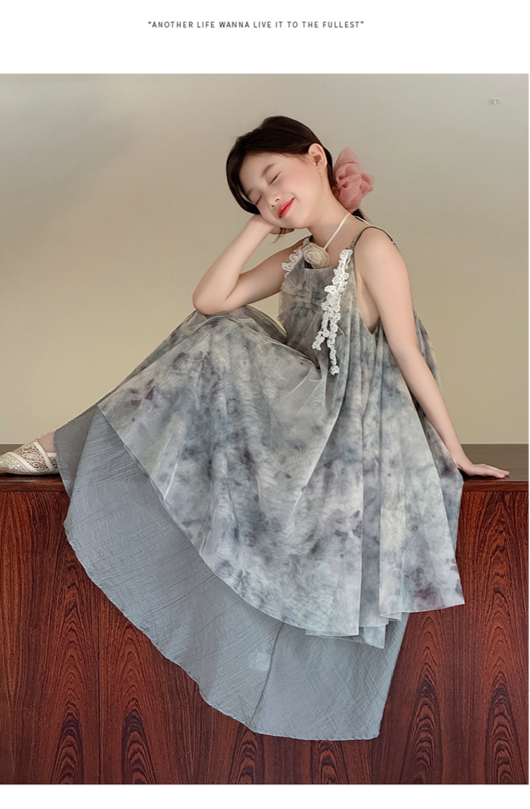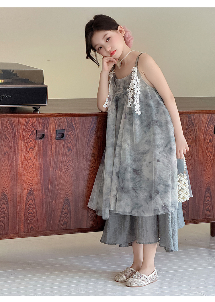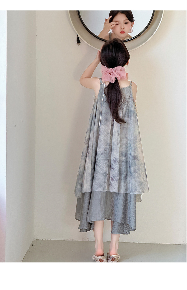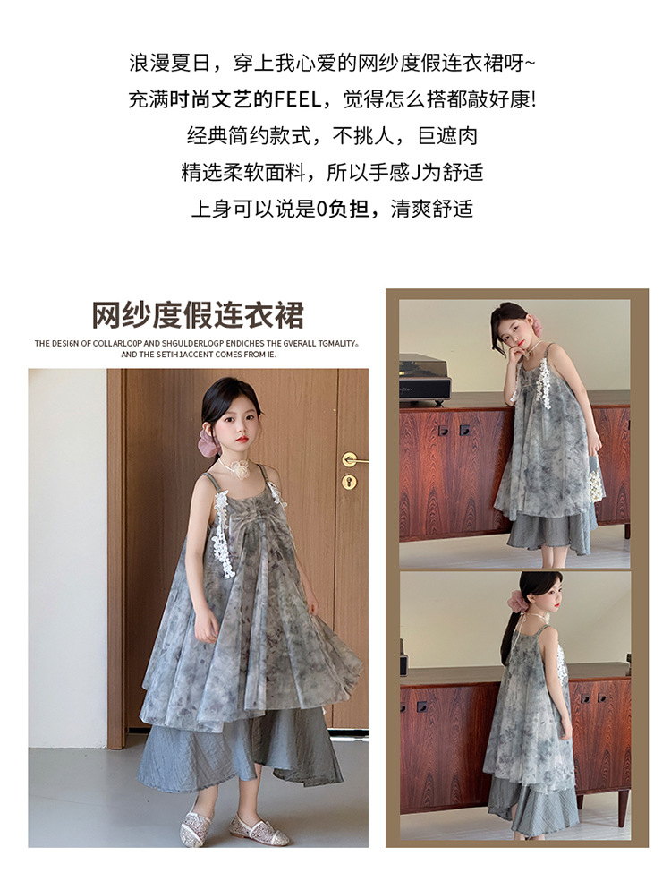 女の子のリゾートスタイルドレス2025夏の新しい大きな子供の水墨画サスペンダースカート西洋スタイルファッショナブルなメッシュスカート