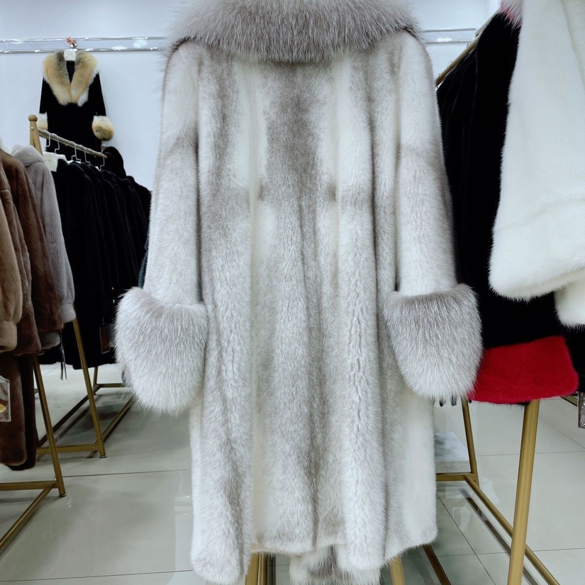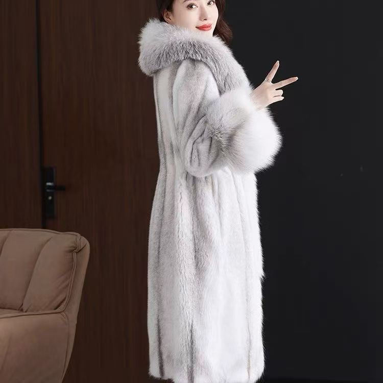 2025 輸入クロスミンク新しいミンクコート女性のフルミンクミッドレングスフォックスファー襟コートミンクフード付き