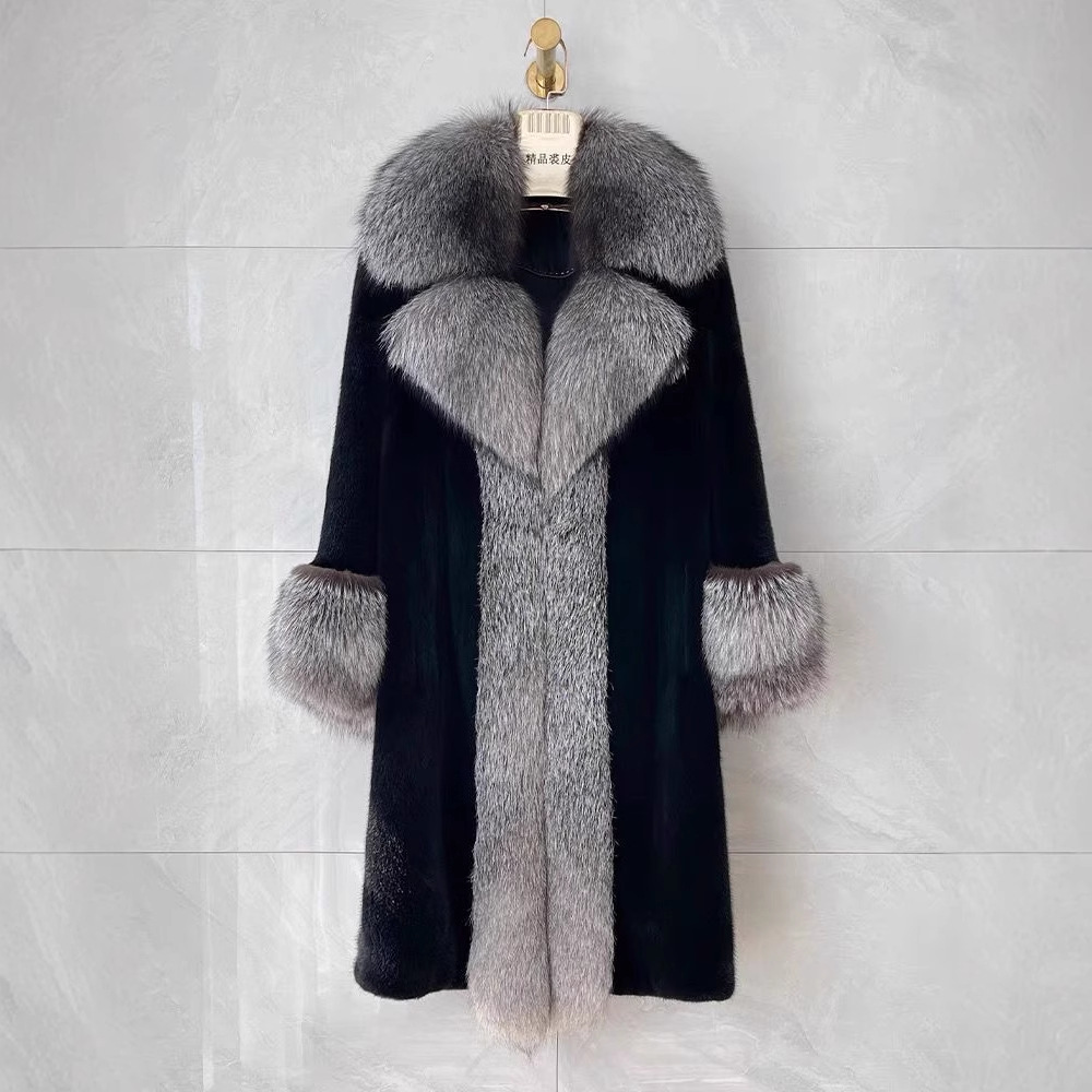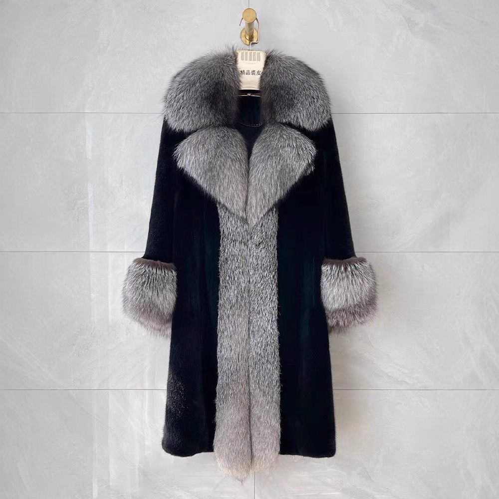 2025进口天鹅绒水貂皮草外套中长款狐狸毛领蝙蝠袖貂大衣女整貂