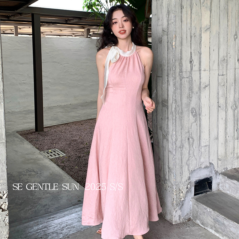 秀煕熙2025夏の新型レトロ高腰ストラップワンピースプリント純欲リゾートスカート女88328