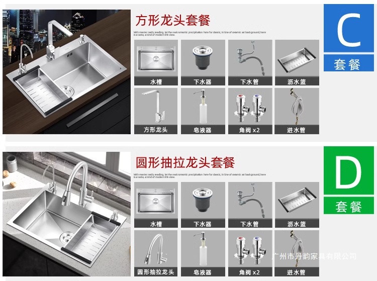 基本A[シンク+防臭排水口+水切りカゴ],パッケージB [304銅芯大湾蛇口] 10年保証,パッケージC [304銅芯角蛇口] 10年保証,パッケージD [304銅芯引き出し水栓] 10年保証,パッケージE [304銅芯引き出し水栓+浄水] 10年保証