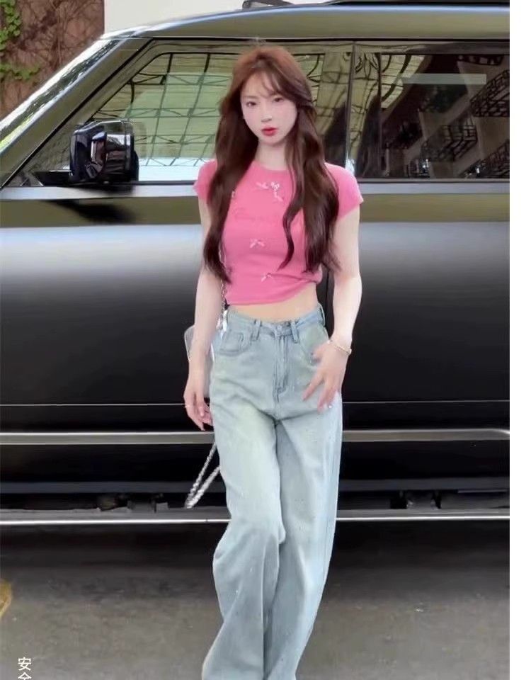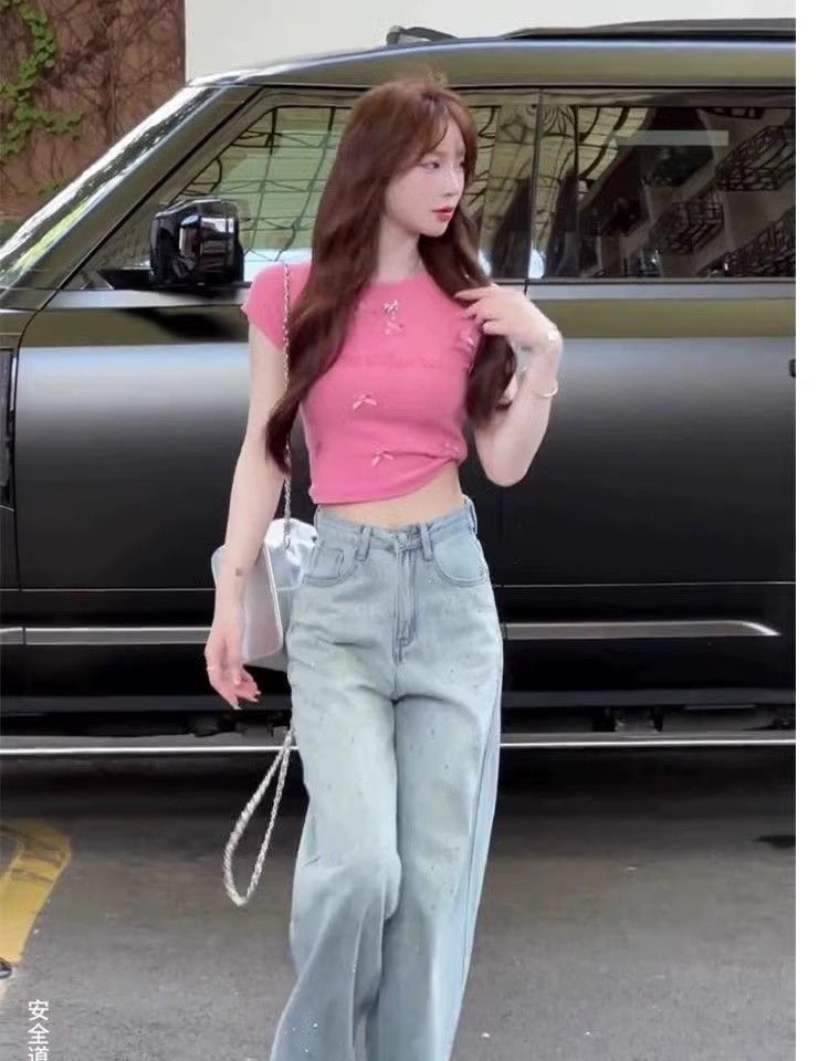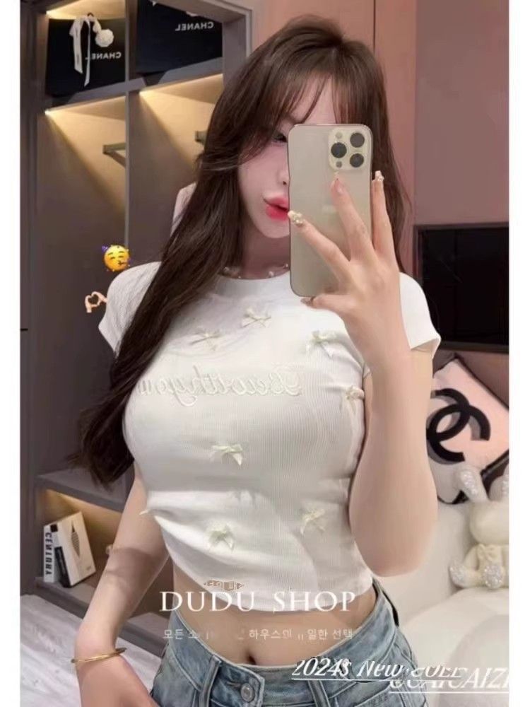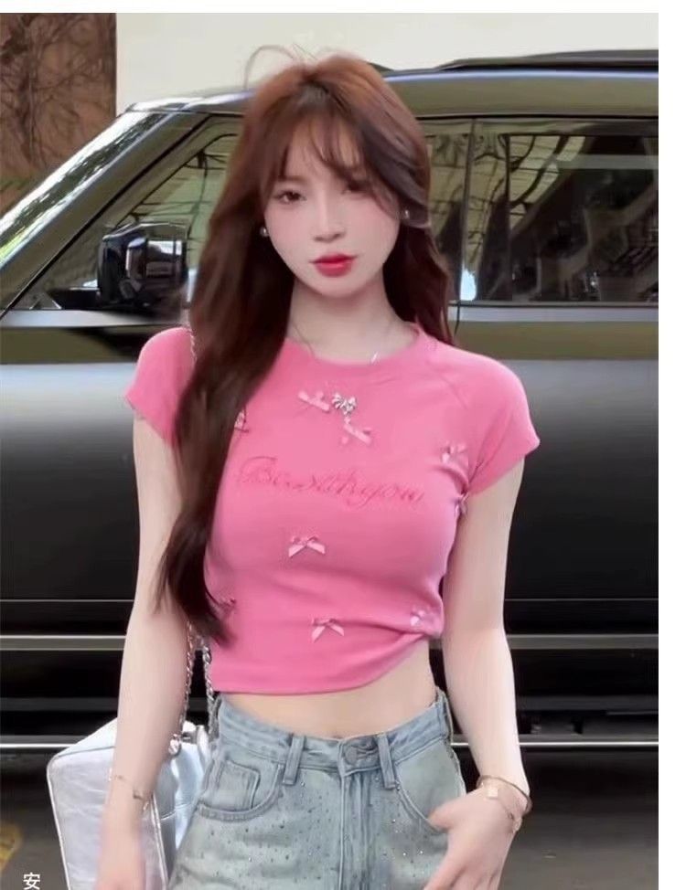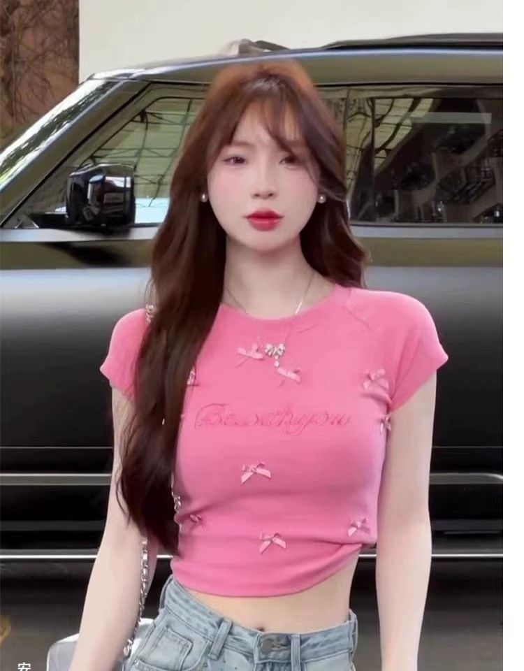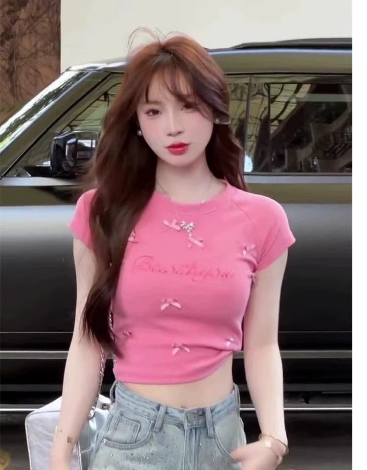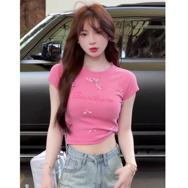 粉色蝴蝶结短袖正肩t恤女夏季修身显瘦打底衫纯欲甜辣妹短款上衣