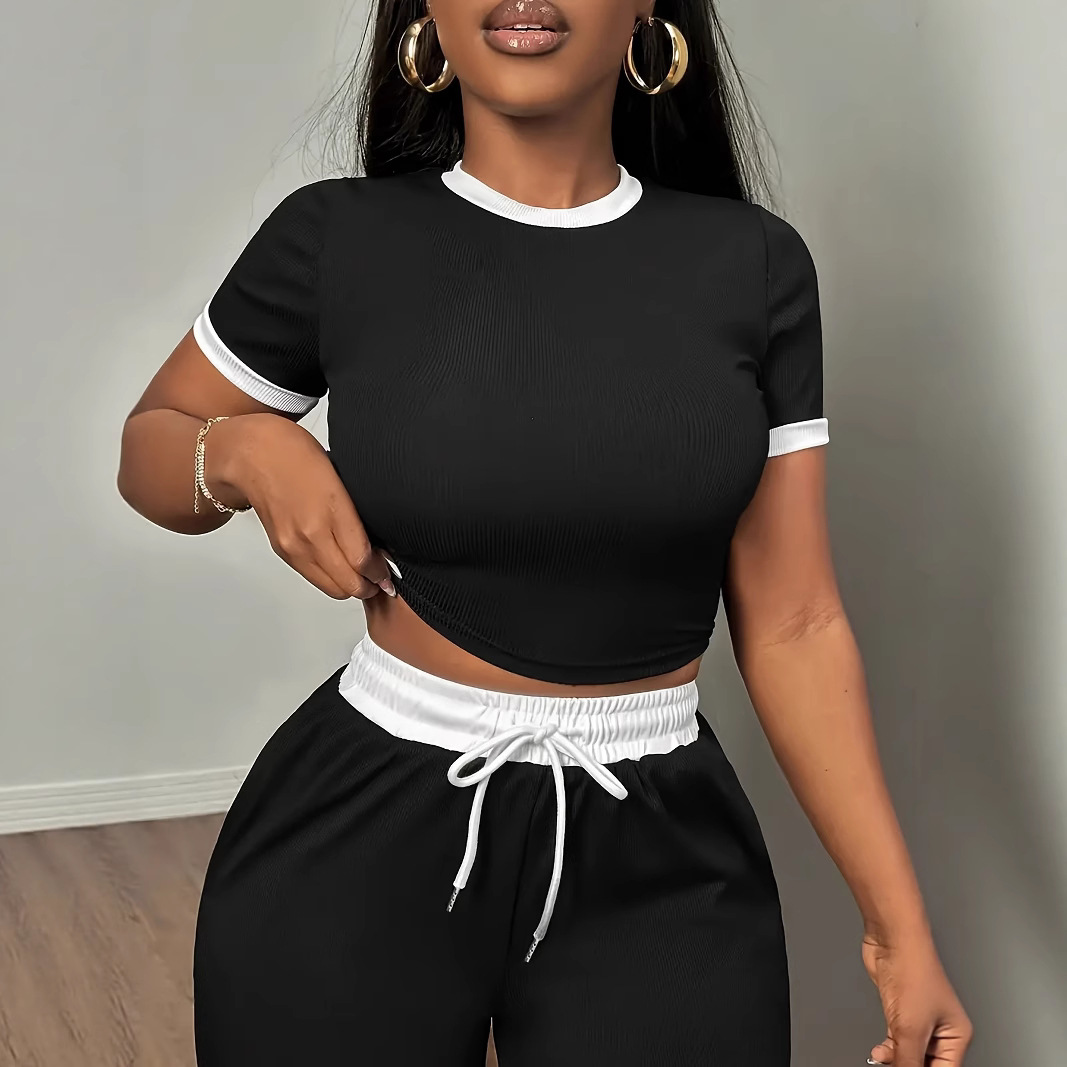 国境を越えたAmazon独立局の売れ筋女性用ツーピースセット、黒と白のコントラストのあるスリムフィットトップとルーズパンツ