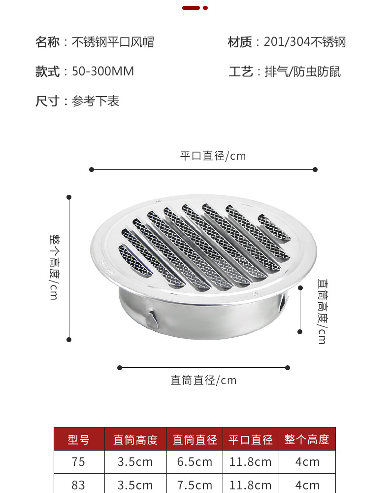 规格 304-75管平面风帽,304-83管平面风帽,304-100管平面风帽,304-110管平面风帽,304-120管平面风帽,304-130管平面风帽,304-140管平面风帽,304-150管平面风帽,304-160管平面风帽,304-170管平面风帽,304-180管平面风帽,304-190管平面风帽,304-200管平面风帽,201-75管平面风帽,201-83管平面风帽,201-100管平面风帽,201-110管平面风帽,201-120管平面风帽,201-130管平面风帽,201-140管平面风帽,201-150管平面风帽,201-160管平面风帽,201-170管平面风帽,201-180管平面风帽,201-190管平面风帽,201-200管平面风帽,201-250管平面风帽,201-300管平面风帽