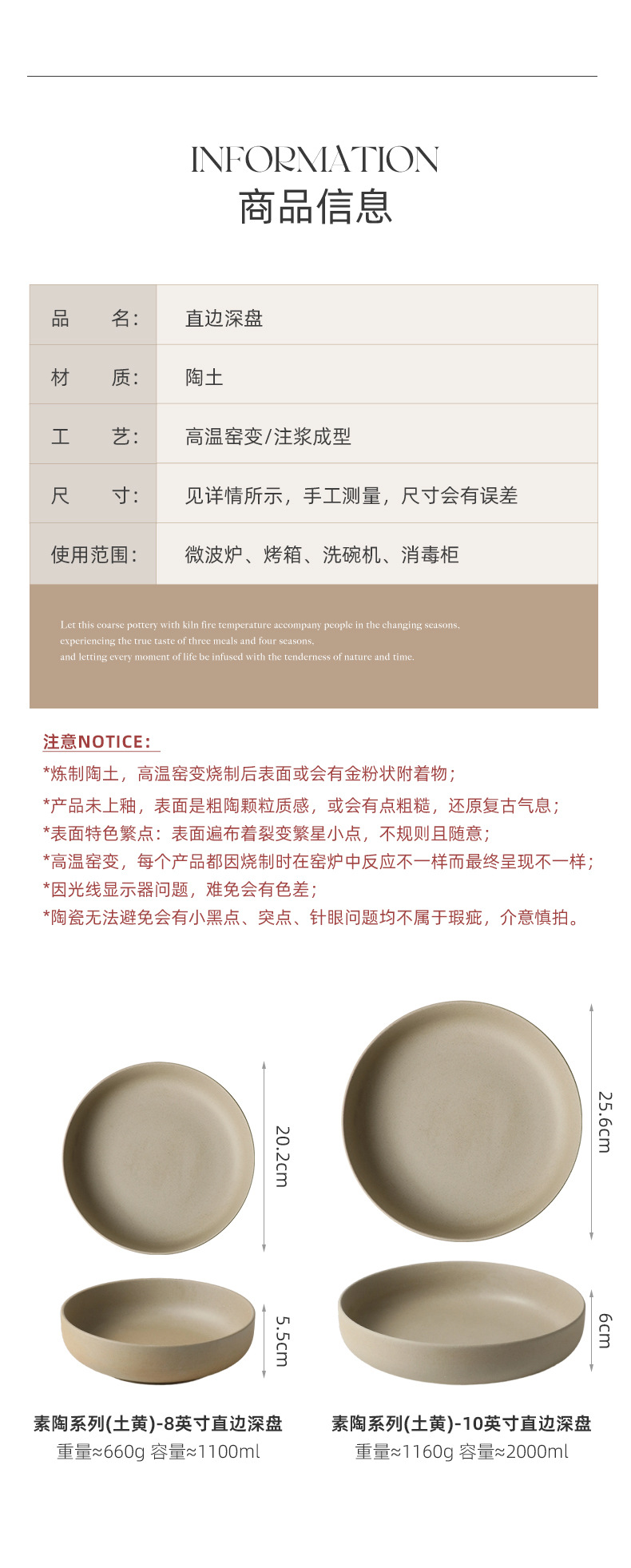 颜色 素陶(土黄)-8英寸直边深盘/长20.2cm,素陶(土黄)-10英寸直边深盘/长25.6cm
