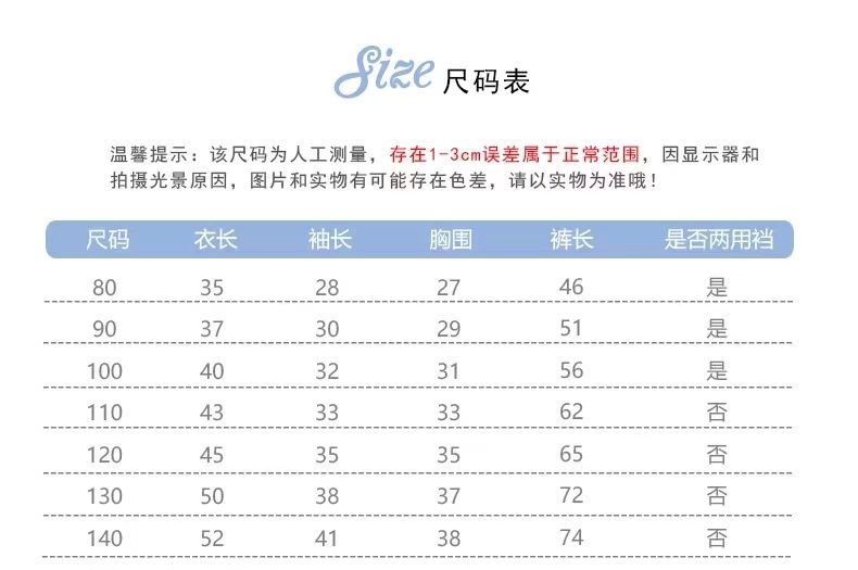 适合身高 80码建议身高60-70cm,90码建议身高70-80cm,100码建议身高80-90cm,110码建议身高90-100cm,120码建议身高100-110cm,130码建议身高110-120cm,140码建议身高120-130cm
