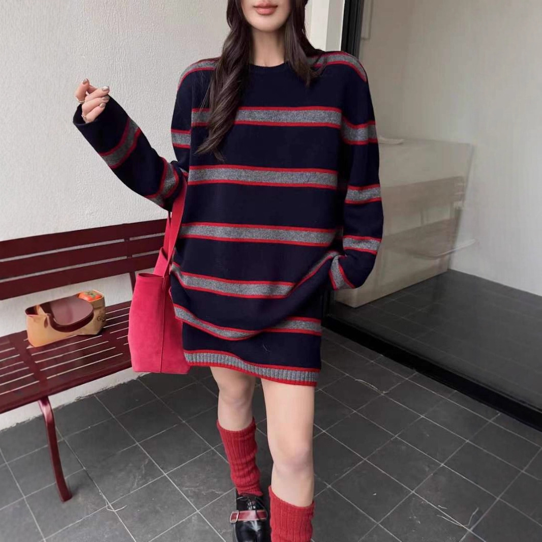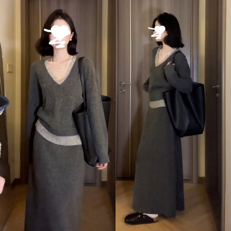 温柔百搭毛衣女长裙2025秋冬新款气质洋气撞色洋气优雅针织两件套