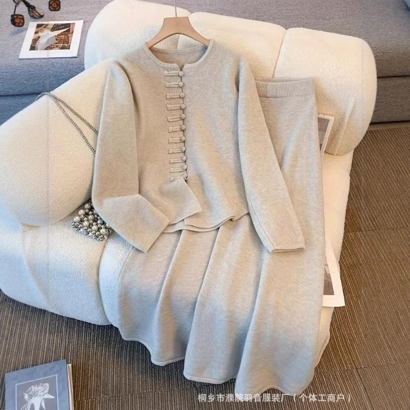 新中式国风针织套装优雅长袖秋冬新款气质减龄长裙毛衣两件套女
