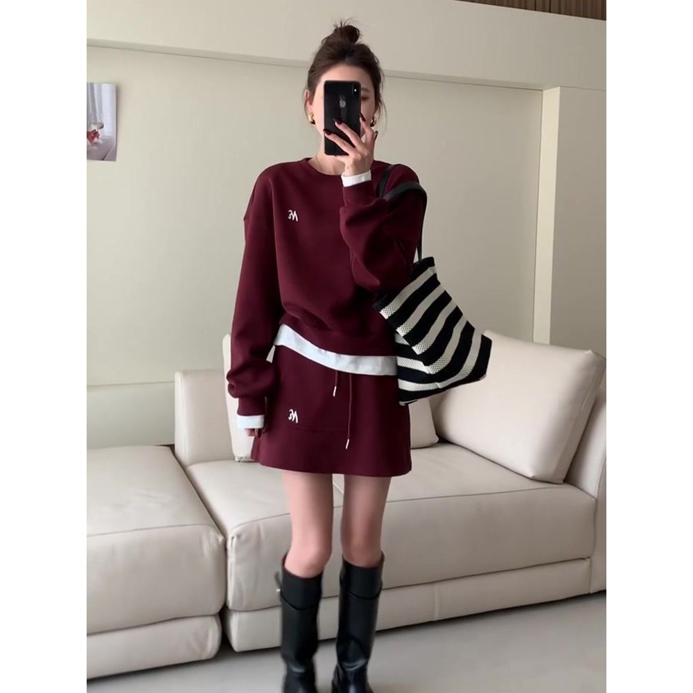 胖mm特大码300斤2025春春秋洋气约会套装裙女酒红色时尚卫衣套装