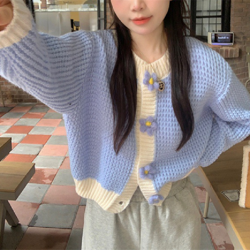 2025秋冬新作、コントラストカラーで若見え&着痩せ効果のあるニットカーディガン、東南アジア向け輸出、小花ボタン付き高品質セーター(女性用)