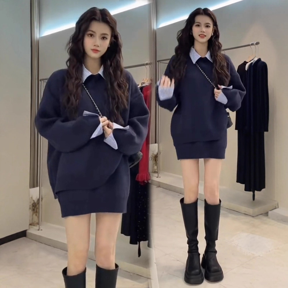2025秋冬时尚针织套装女新款韩系半身裙假两件衬衫领拼接长袖毛衣