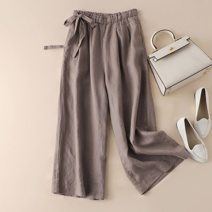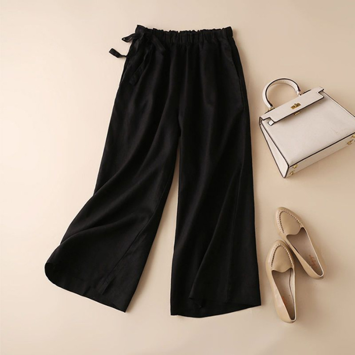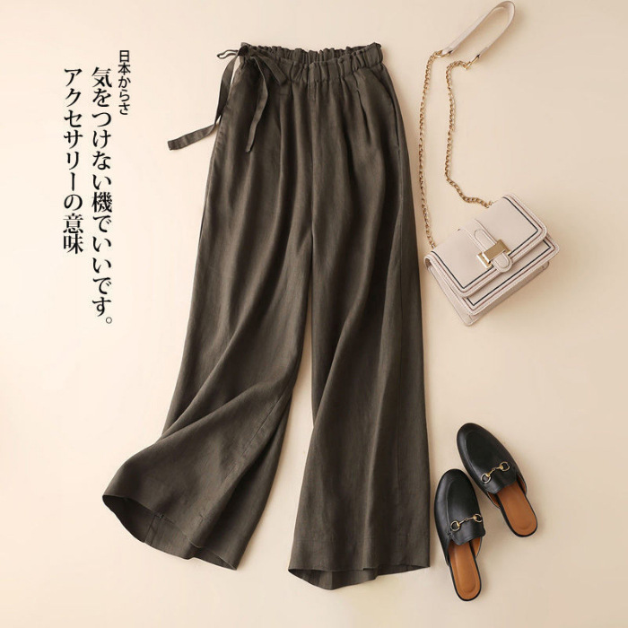 春と夏の綿とリネンのハイウエストサイドレースレトロ文学弾性9点ワイドレッグパンツカジュアルパンツ女性のための外国貿易卸売