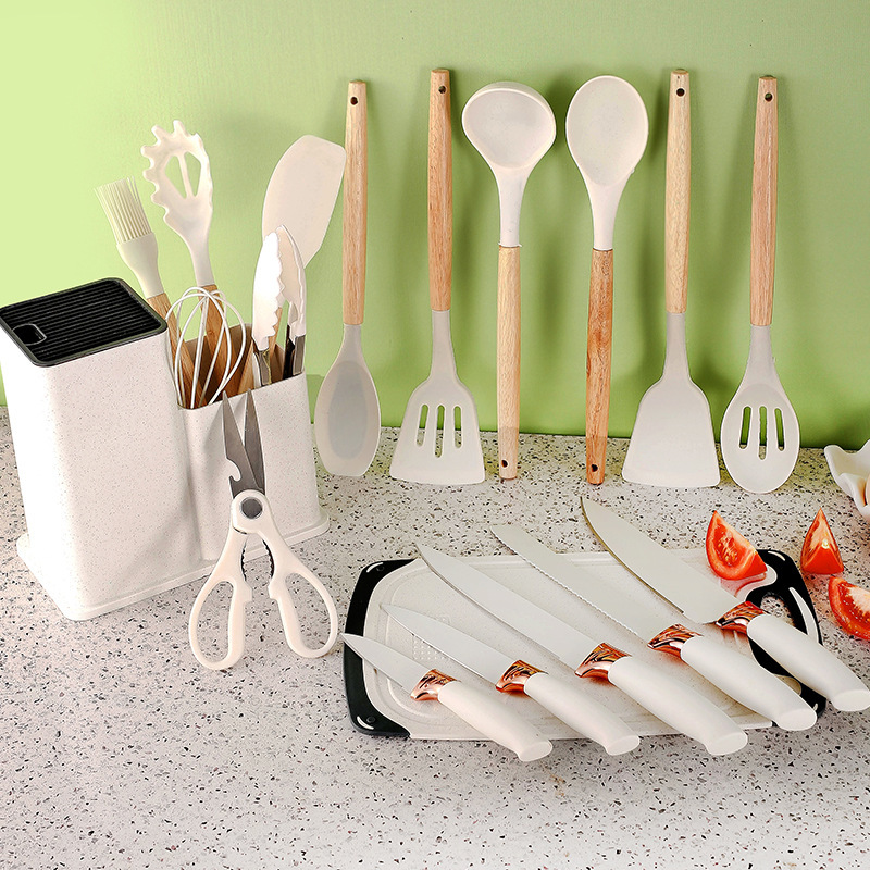 カスタマイズされたシリコン木製ハンドルキッチン用品 19 点セットノンスティックスパチュラスプーンキッチン家庭用包丁肉切り包丁セット