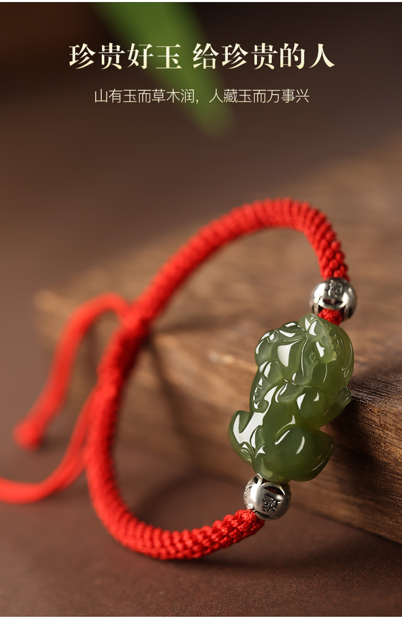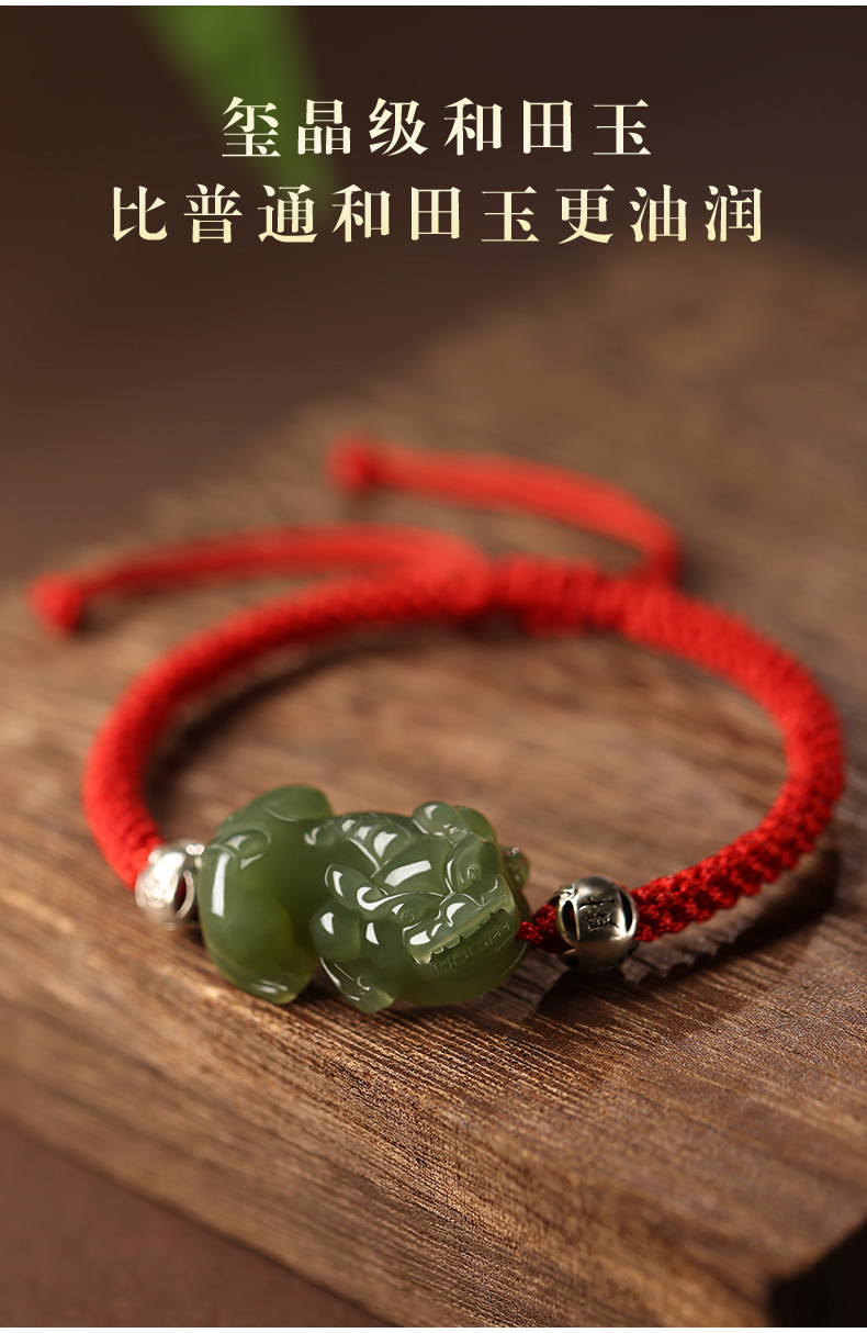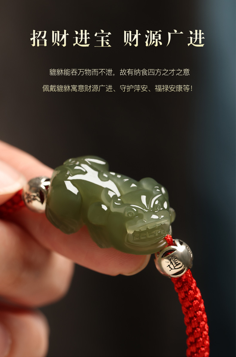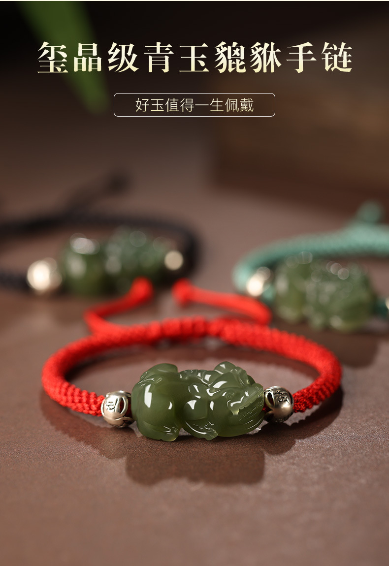 和田玉招财貔貅情侣小貔貅青玉手链男皮质手链女红绳编织手绳