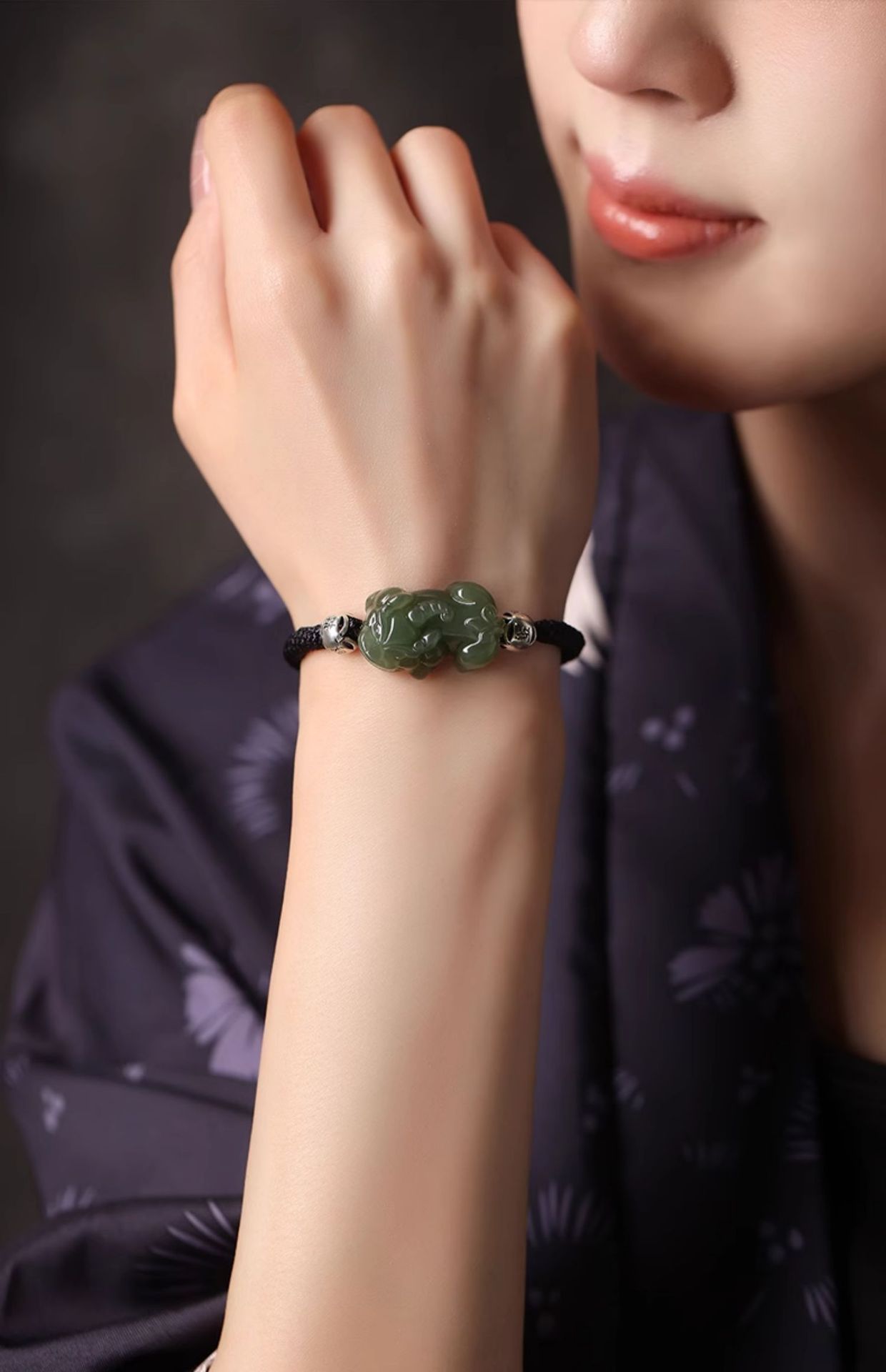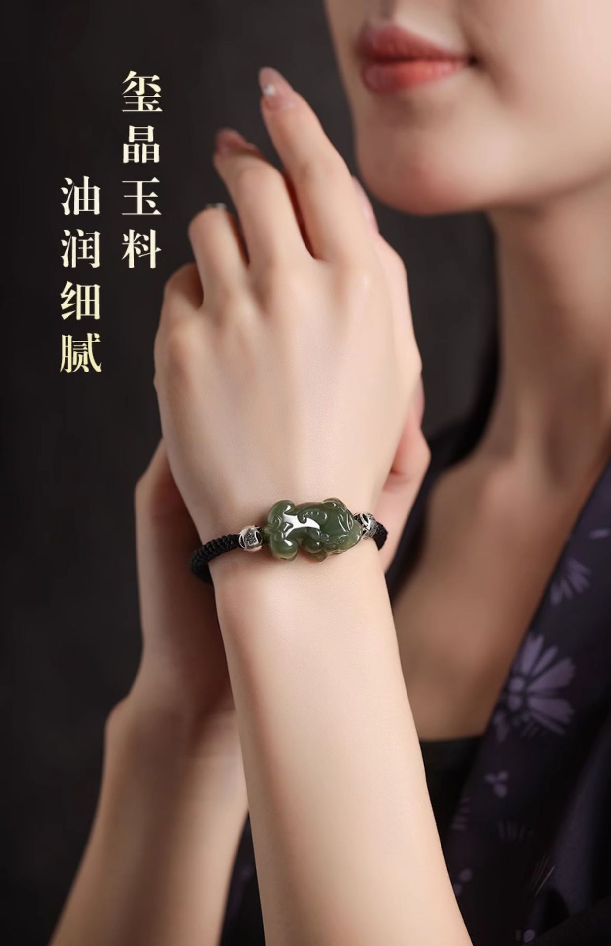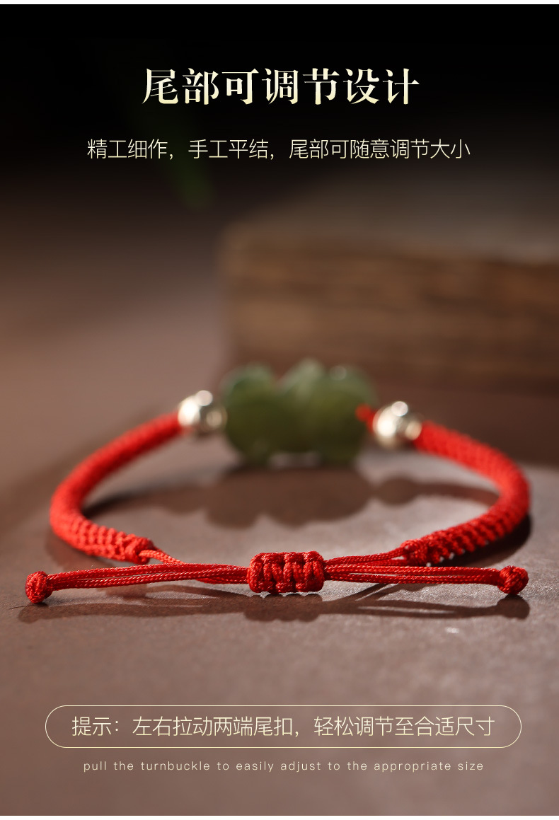 和田玉招财貔貅情侣小貔貅青玉手链男皮质手链女红绳编织手绳