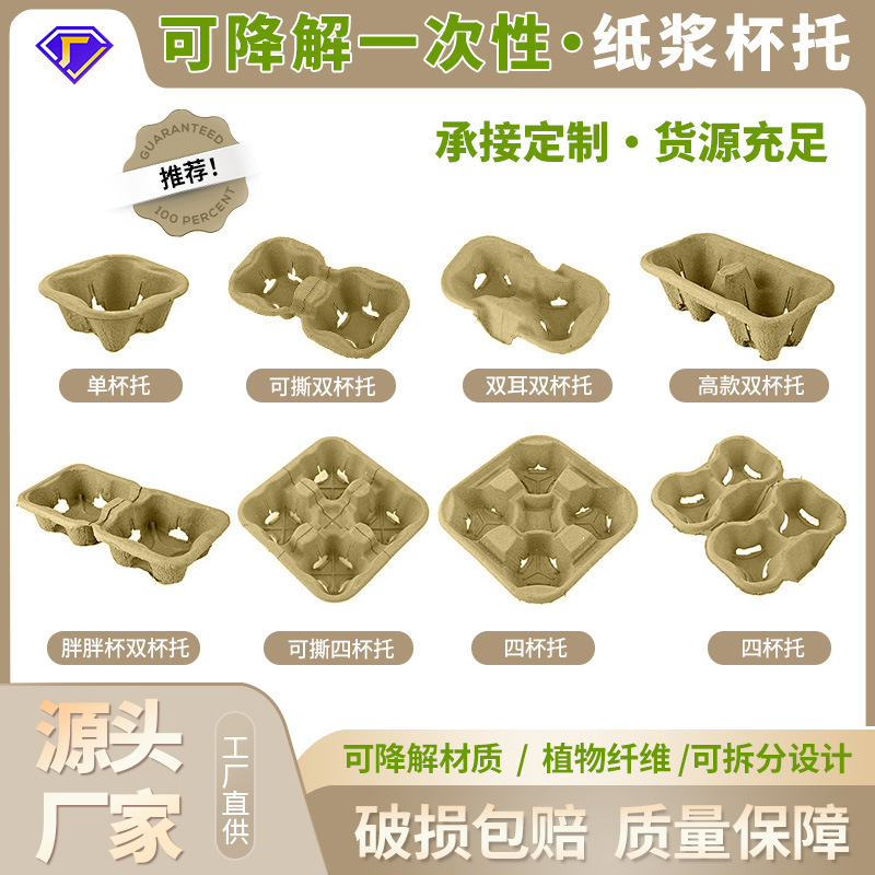 可降解咖啡奶茶纸杯托+咖啡打包袋 纸浆单双耳可撕杯托