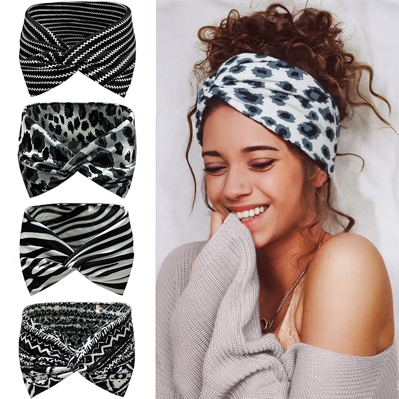 跨境亚马逊欧美豹纹宽边交叉头带瑜伽运动发带止汗弹力女士发饰