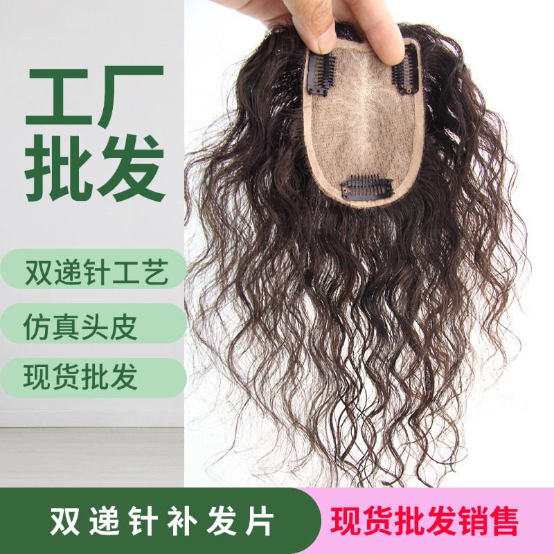 双递针头顶补发片真发无痕隐形遮白发羊毛卷假发片全手织仿真头皮