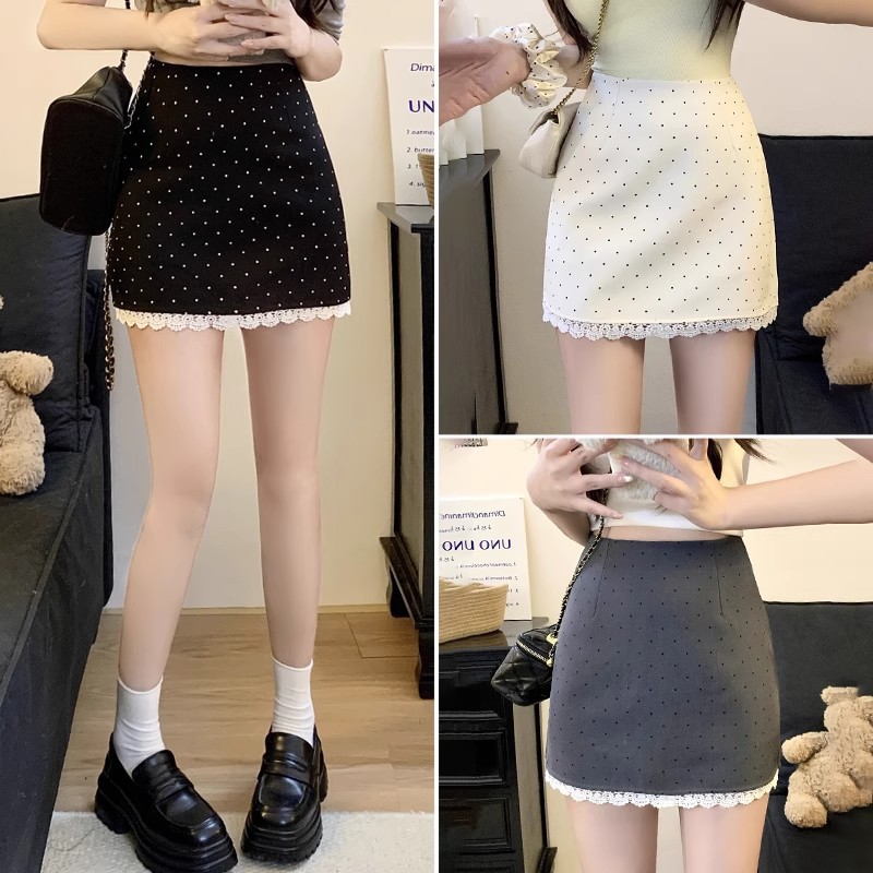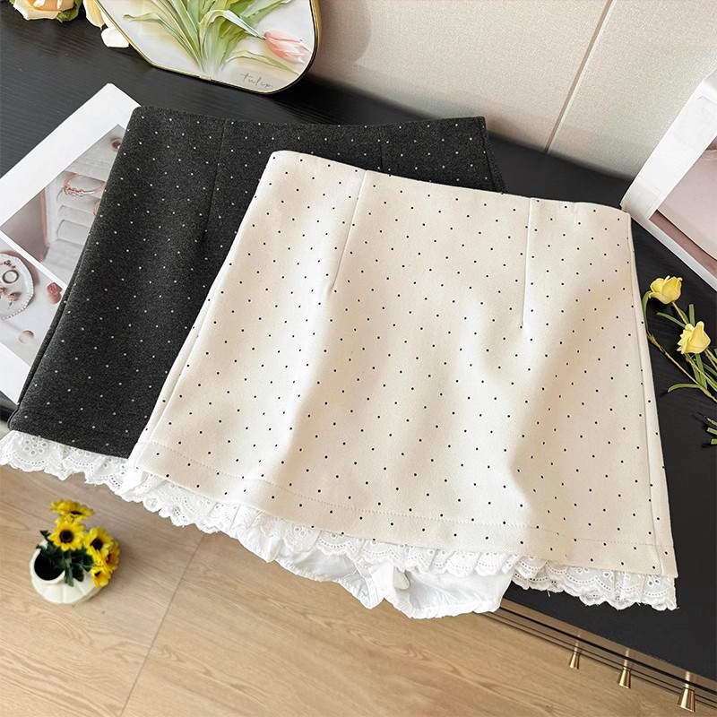 法式木耳边蕾丝拼接波点西装半身裙女2025秋季高腰A字防走光短裙