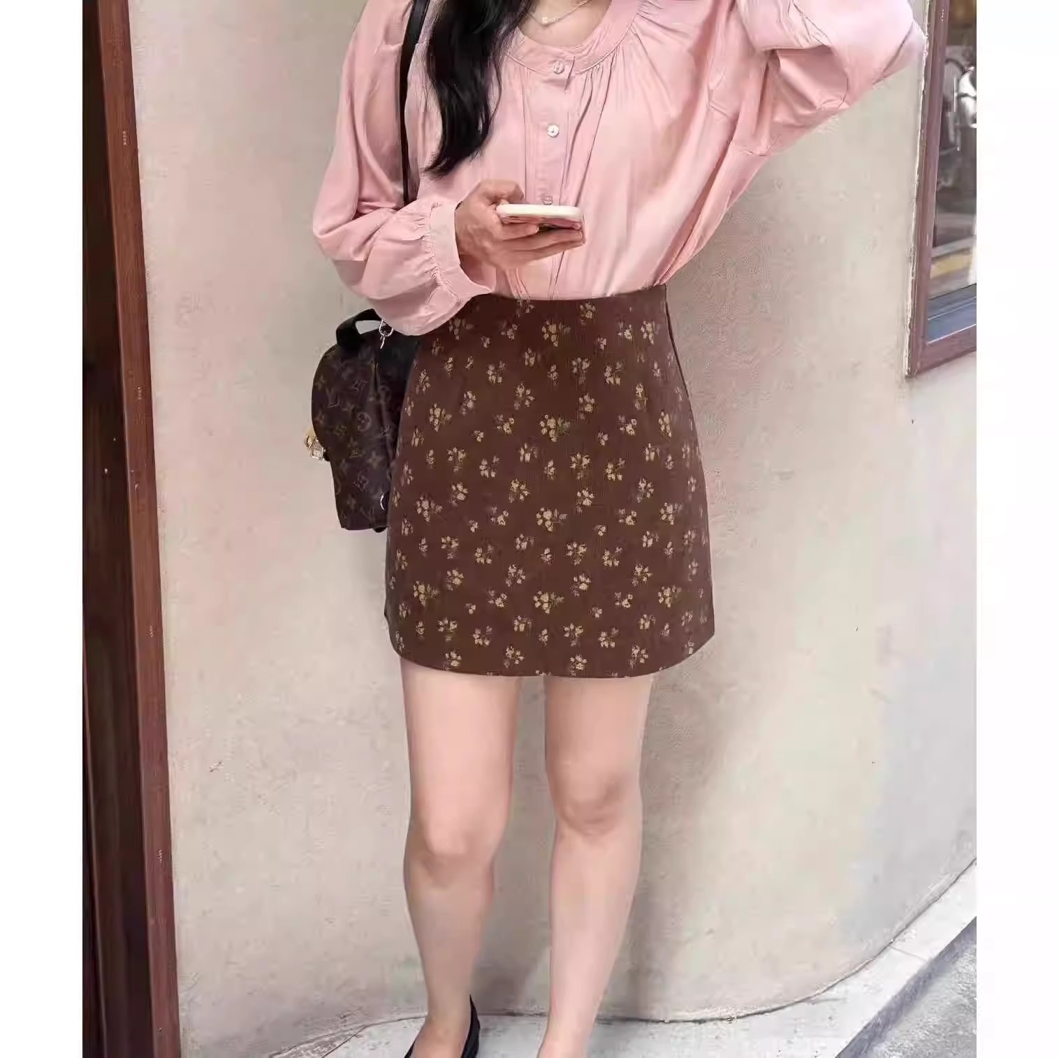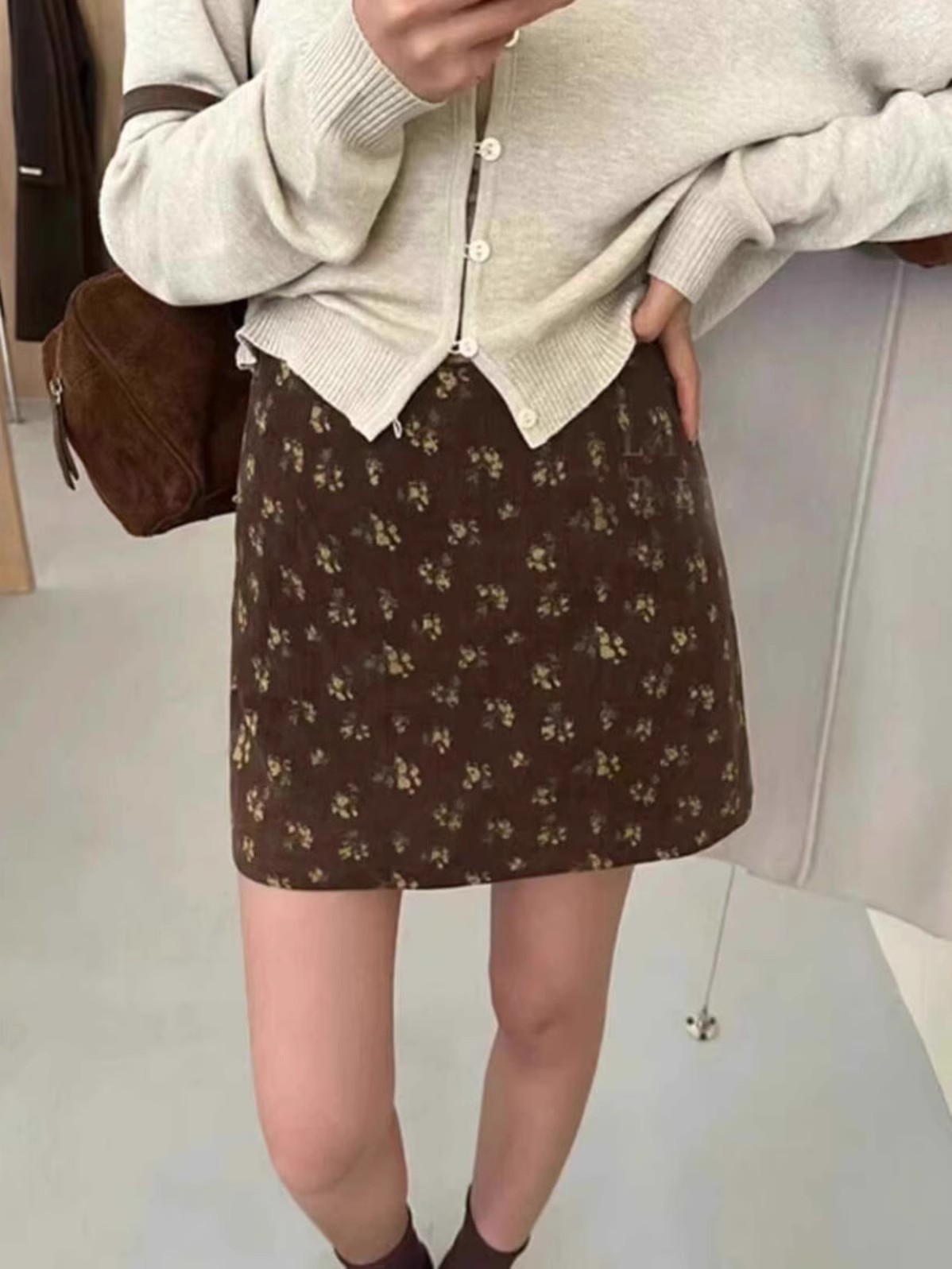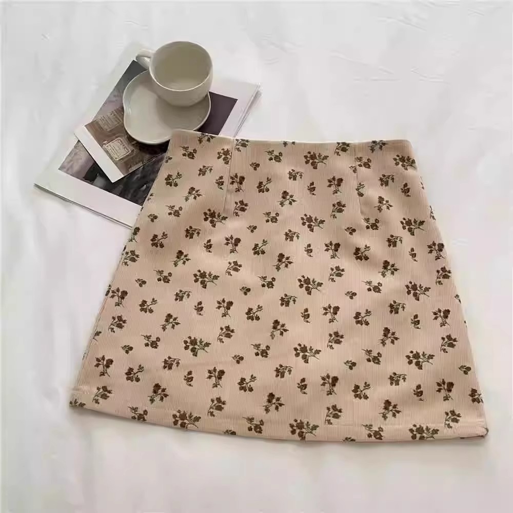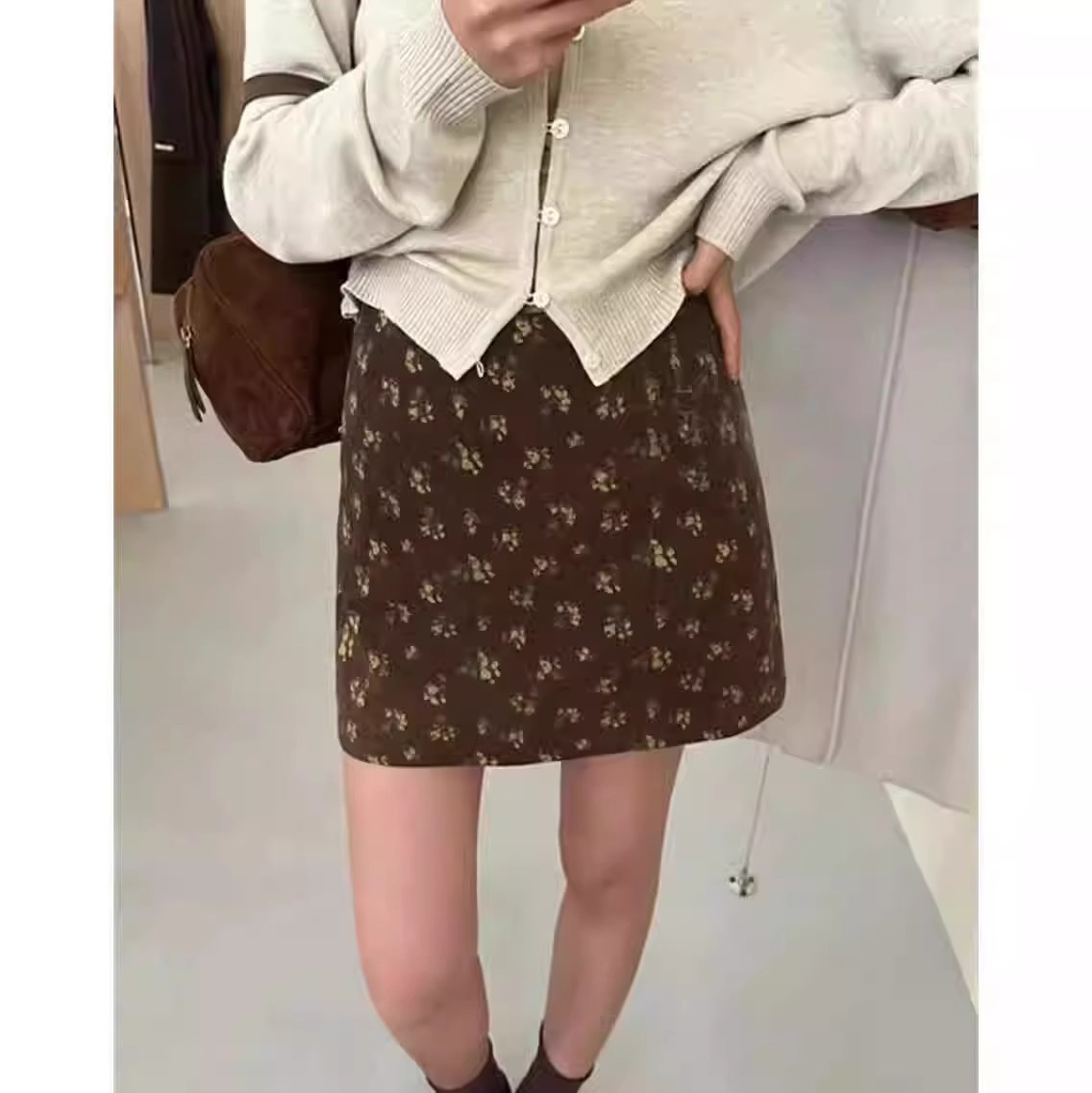 2025 秋冬花柄コーデュロイヒップカバーショートスカートレディースデザインハイウエストカジュアル A ライン多用途気質スカート