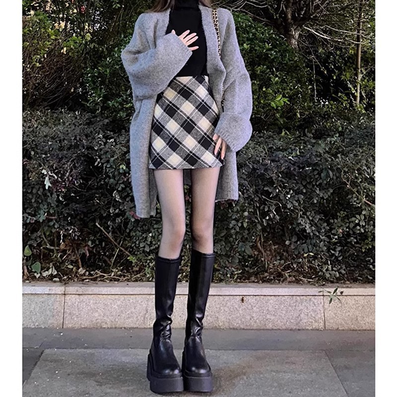 法式复古毛呢格纹半身裙女秋冬显瘦高腰配黑丝a字辣妹包臀短裙子
